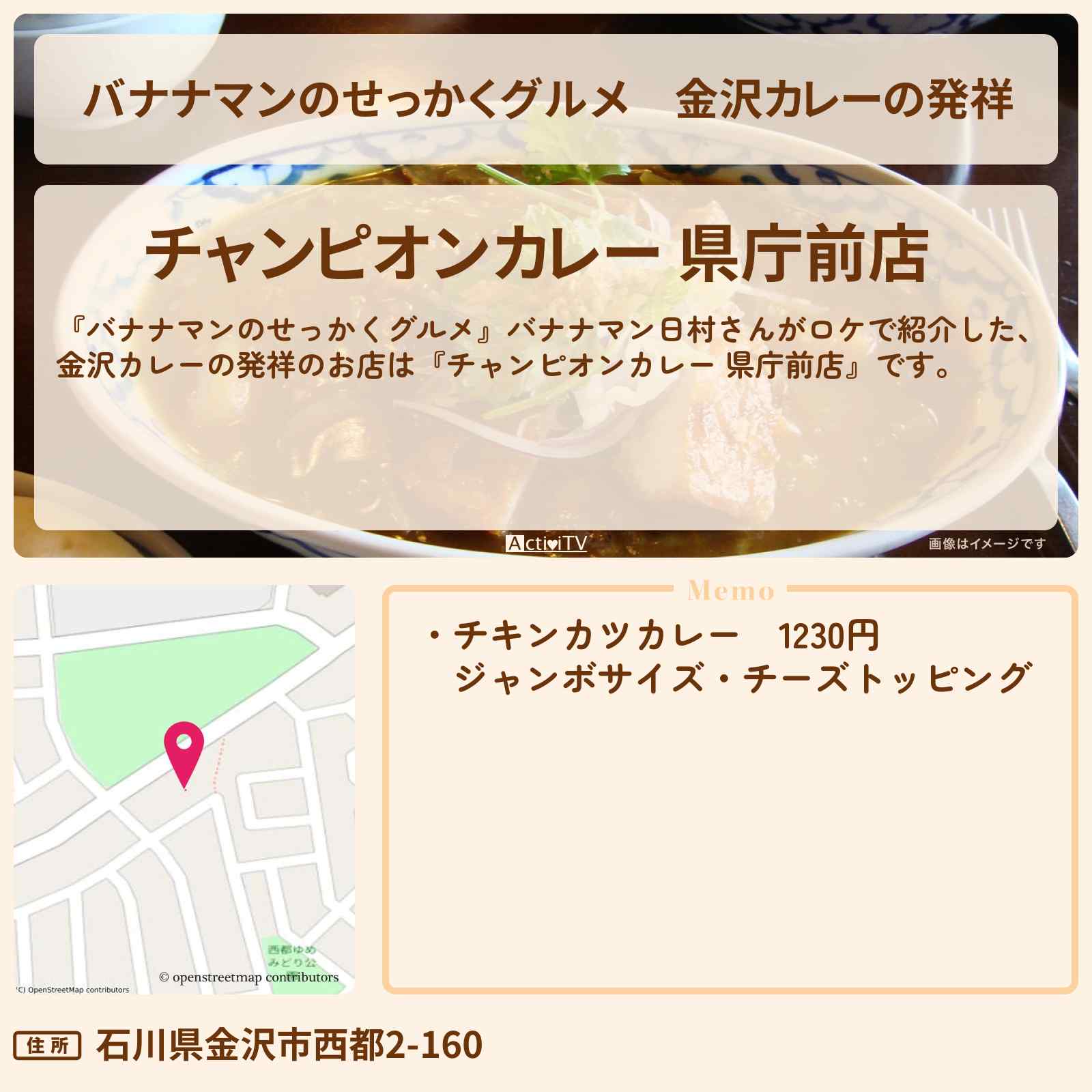 【バナナマンのせっかくグルメ】金沢カレーの発祥『チャンピオンカレー 県庁前店』のお店の場所〔日村勇紀〕