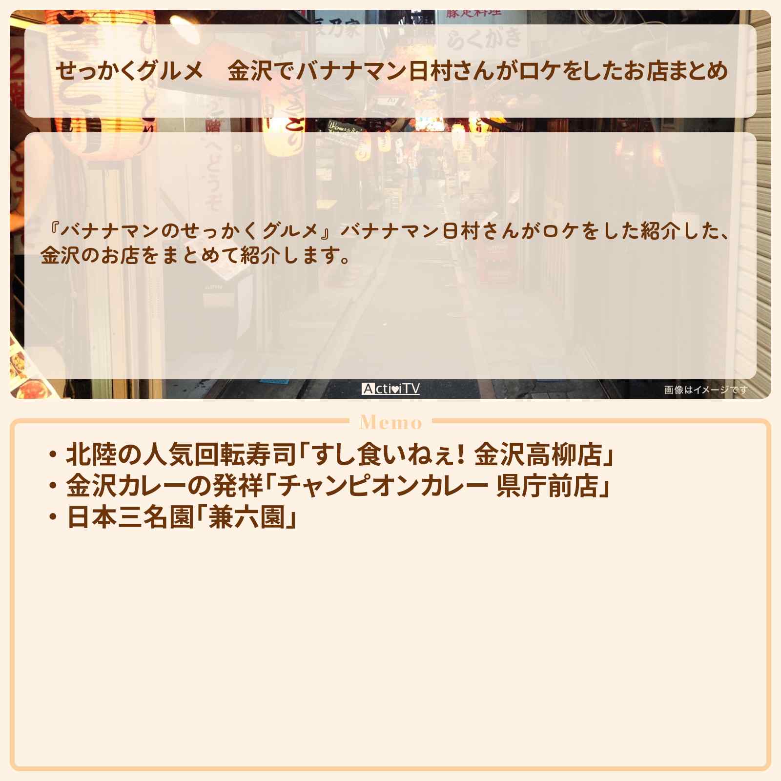 日村さんが以前訪れた金沢の人気回転寿司の『すし食いねぇ』でマグロやアナゴ珍味などを堪能&金沢カレー発祥の『チャンピオンカレー』でデカ盛りカレーを堪能しました。