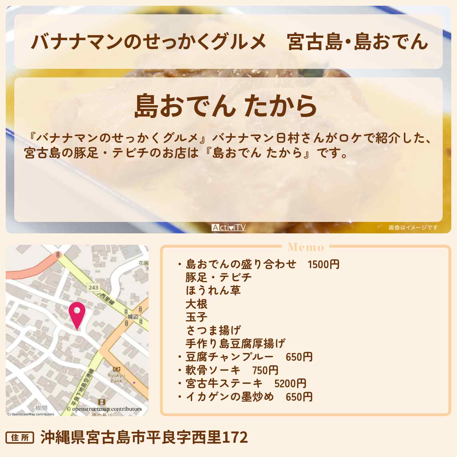 [居酒屋好き人気店☆] こちらは『島おでんたから(宮古島/居酒屋)』のお店ページです。実名でのオススメが56件集まっています。Rettyで食が好きなグルメな人たちからお店を探そう!…