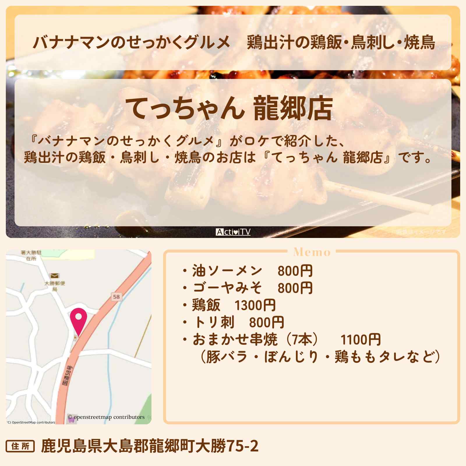 こちらは『てっちゃん 龍郷店(奄美/焼き鳥)』のお店ページです。Rettyで食が好きなグルメな人たちからお店を探そう!