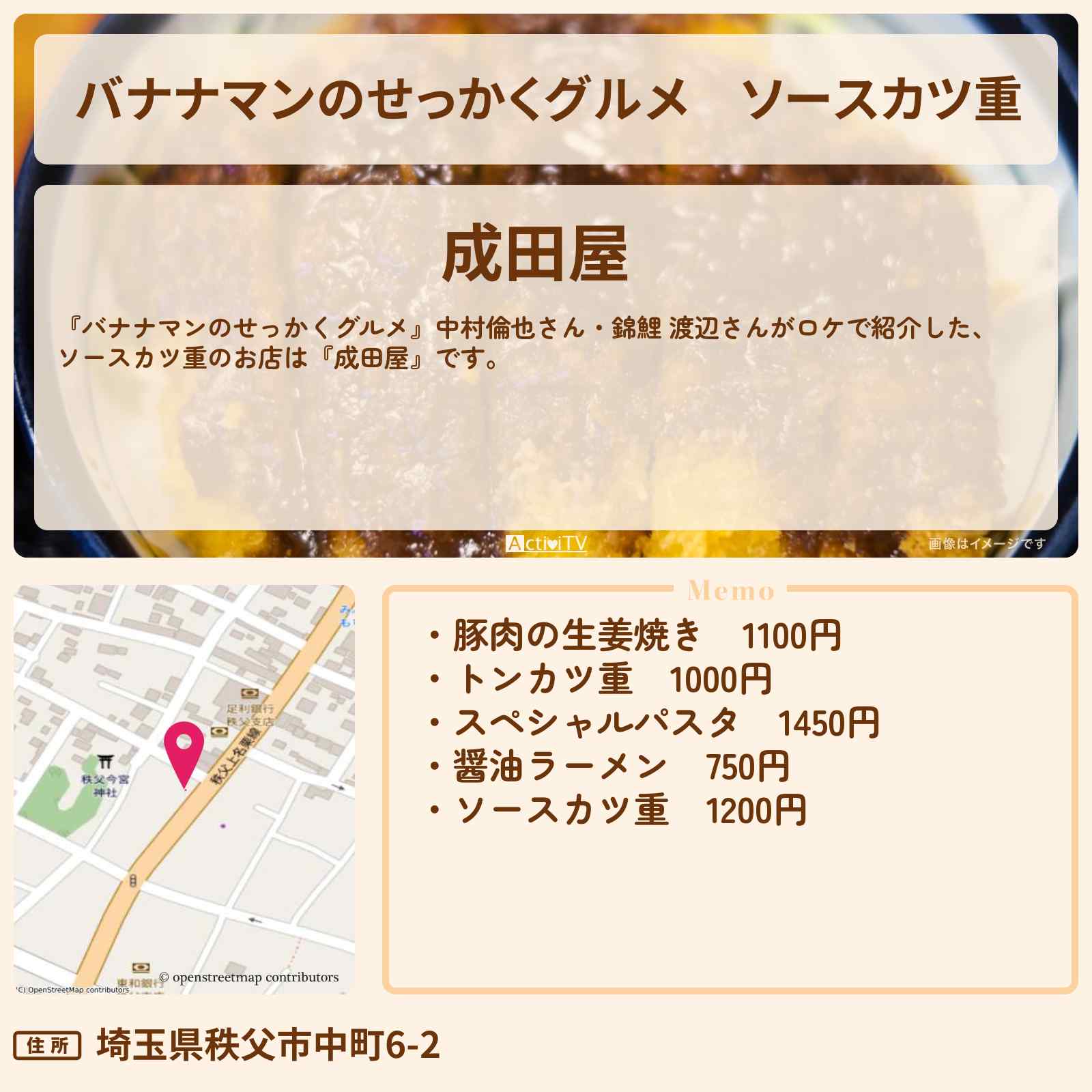 放送の【バナナマンのせっかくグルメ】中村倫也さん・錦鯉 渡辺さんがロケで紹介した、ソースカツ重のお店は『成田屋』です。