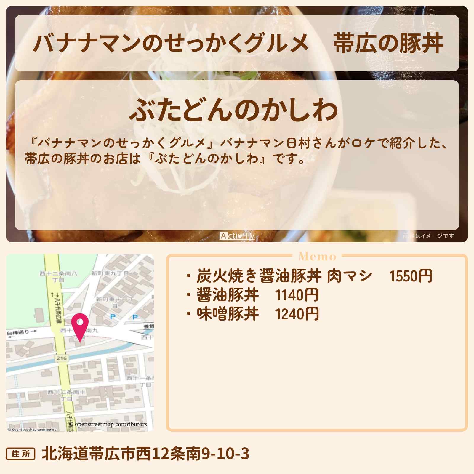 ぶたどんのかしわは、北海道帯広市西12条にある豚丼の専門店。最寄り駅は帯広駅。十勝産豚肉を炭火で香ばしく焼き上げた絶品の豚丼。本場ご当地の味をぜひご堪能ください。
