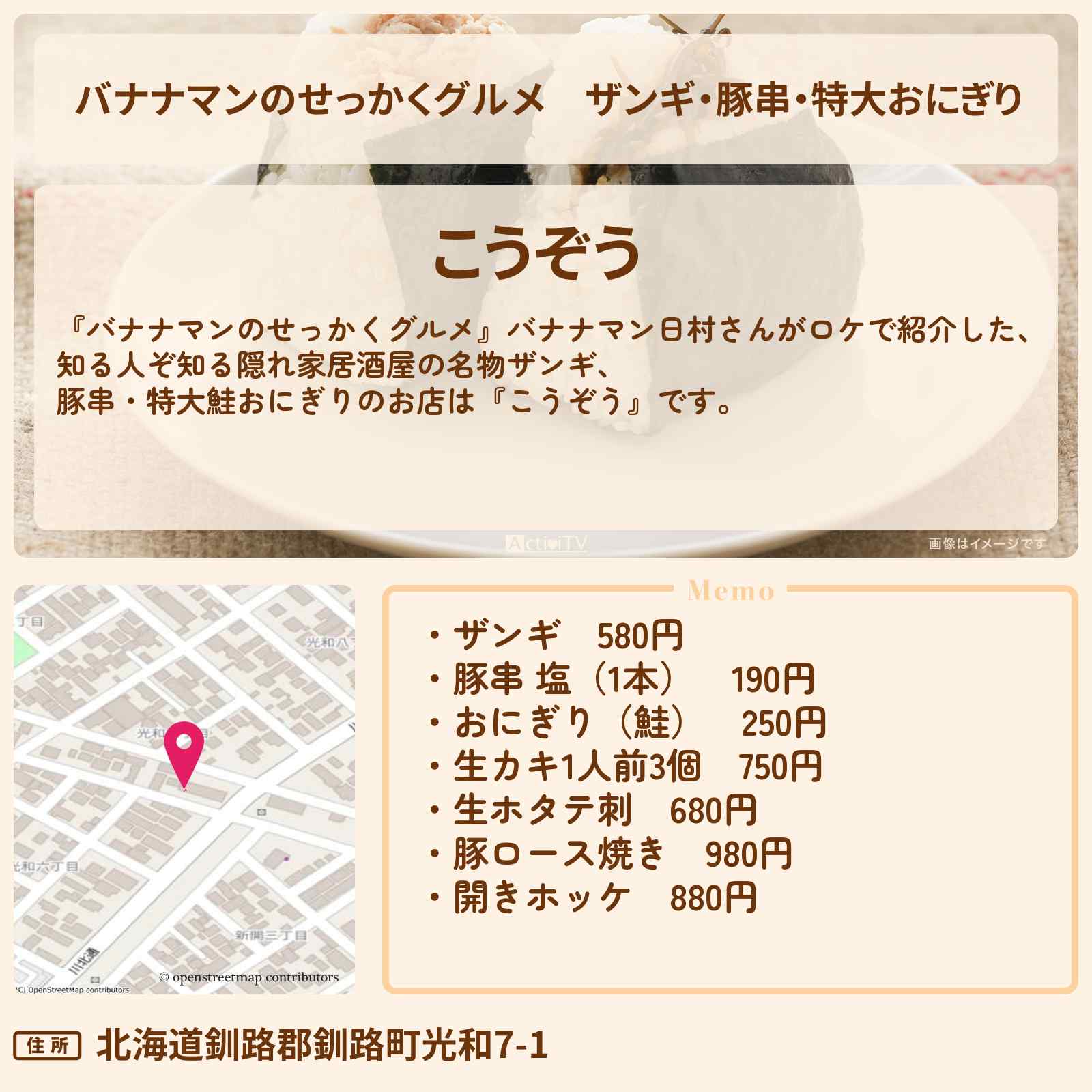 釧路町光和の住宅街にお店を構える『居酒屋こうぞう』です。常連さんが多く、入りにくいのではと思う方がいるかもしれませんが、お酒を飲まず食事だけを楽しみにいらっしゃるファミリー層の方々も多いです。駐車場も……