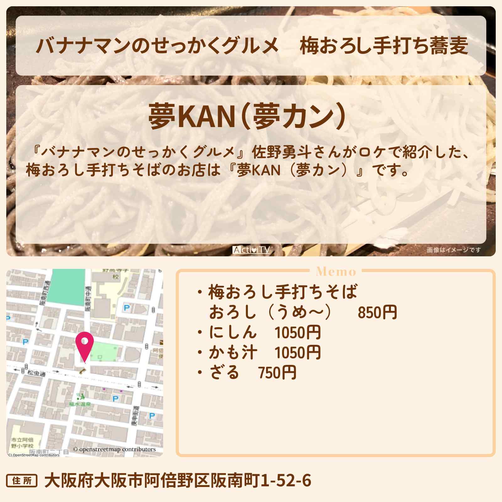【バナナマンのせっかくグルメ】梅おろし手打ち蕎麦『夢KAN(夢カン)』大阪のお店の場所〔佐野勇斗・M!LK〕