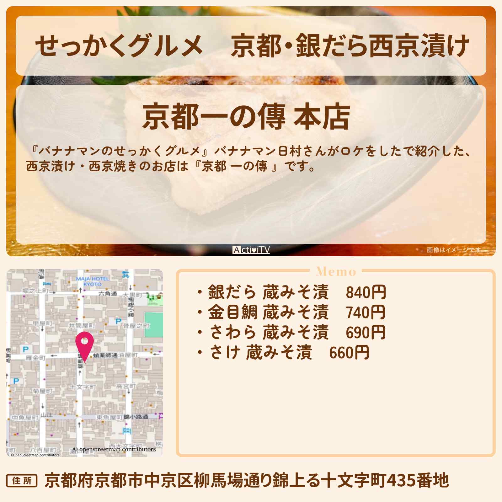 放送の【バナナマンのせっかくグルメ】バナナマン日村さんがロケをしたで紹介した、西京漬け・西京焼きのお店は『京都 一の傳 』です。