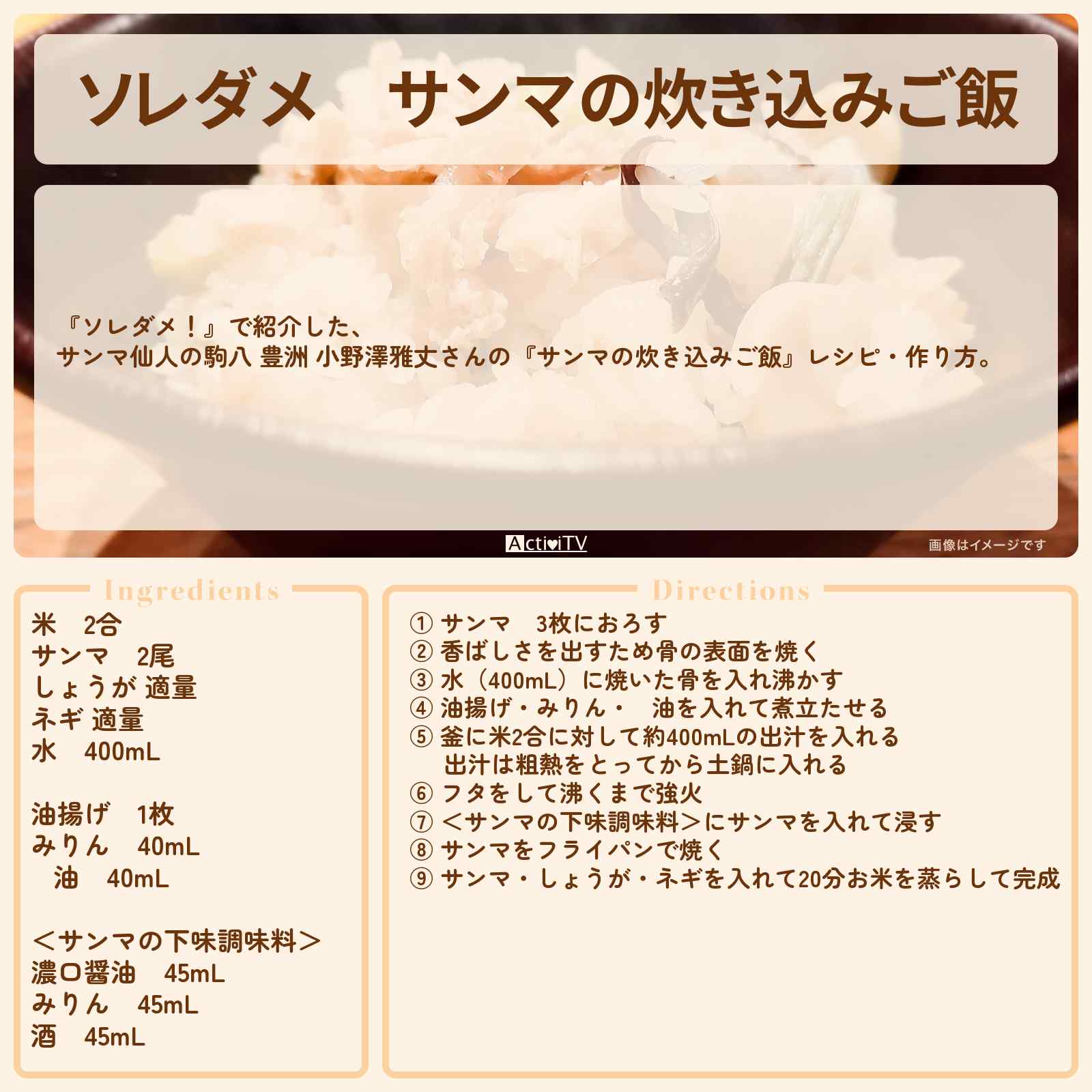 (水)放送の【ソレダメ!】で紹介した、サンマ仙人の駒八 豊洲 小野澤雅丈さんの『サンマの炊き込みご飯』レシピ・作り方。
