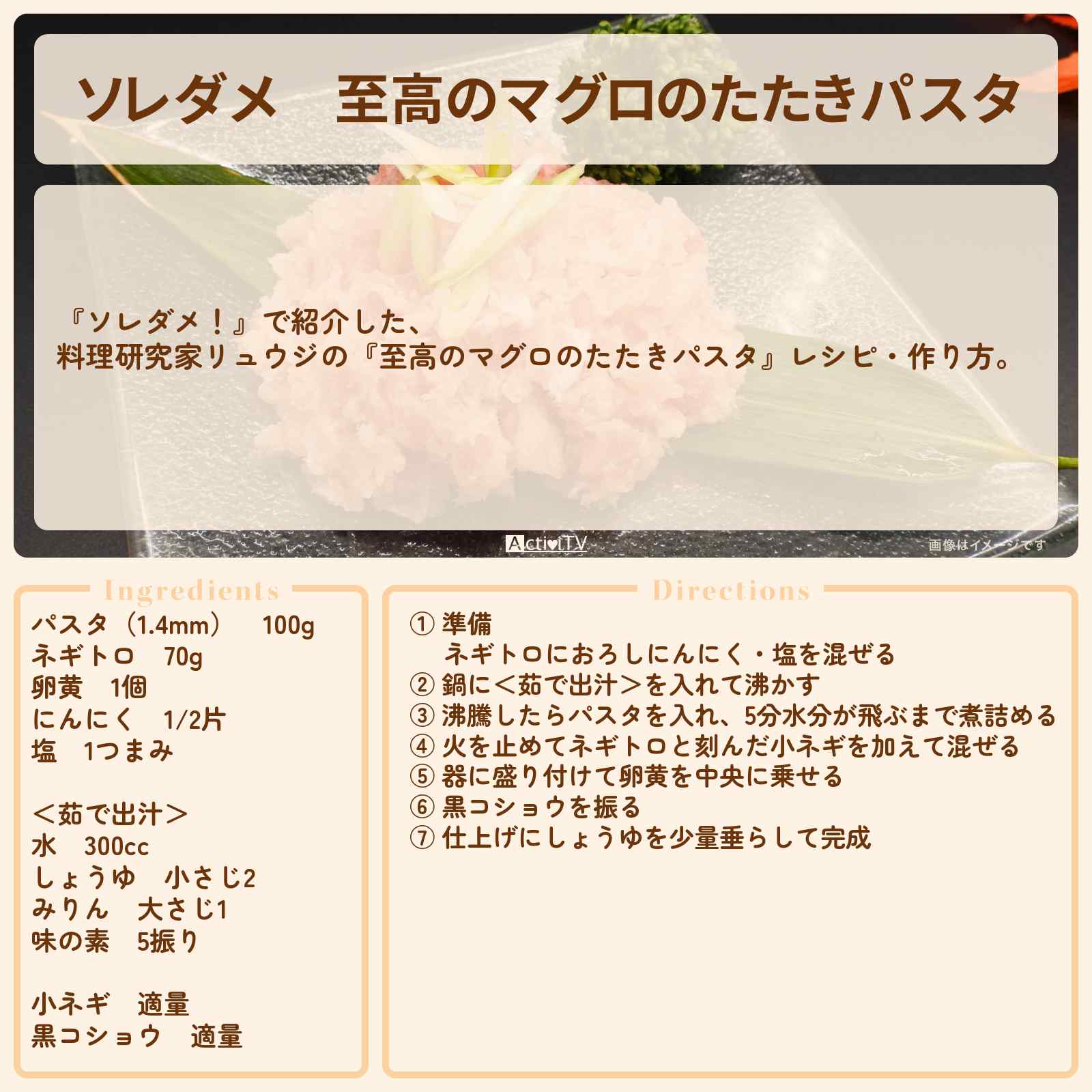 (水)放送の【ソレダメ!】で紹介した、料理研究家リュウジの『至高のマグロのたたきパスタ』レシピ・作り方。