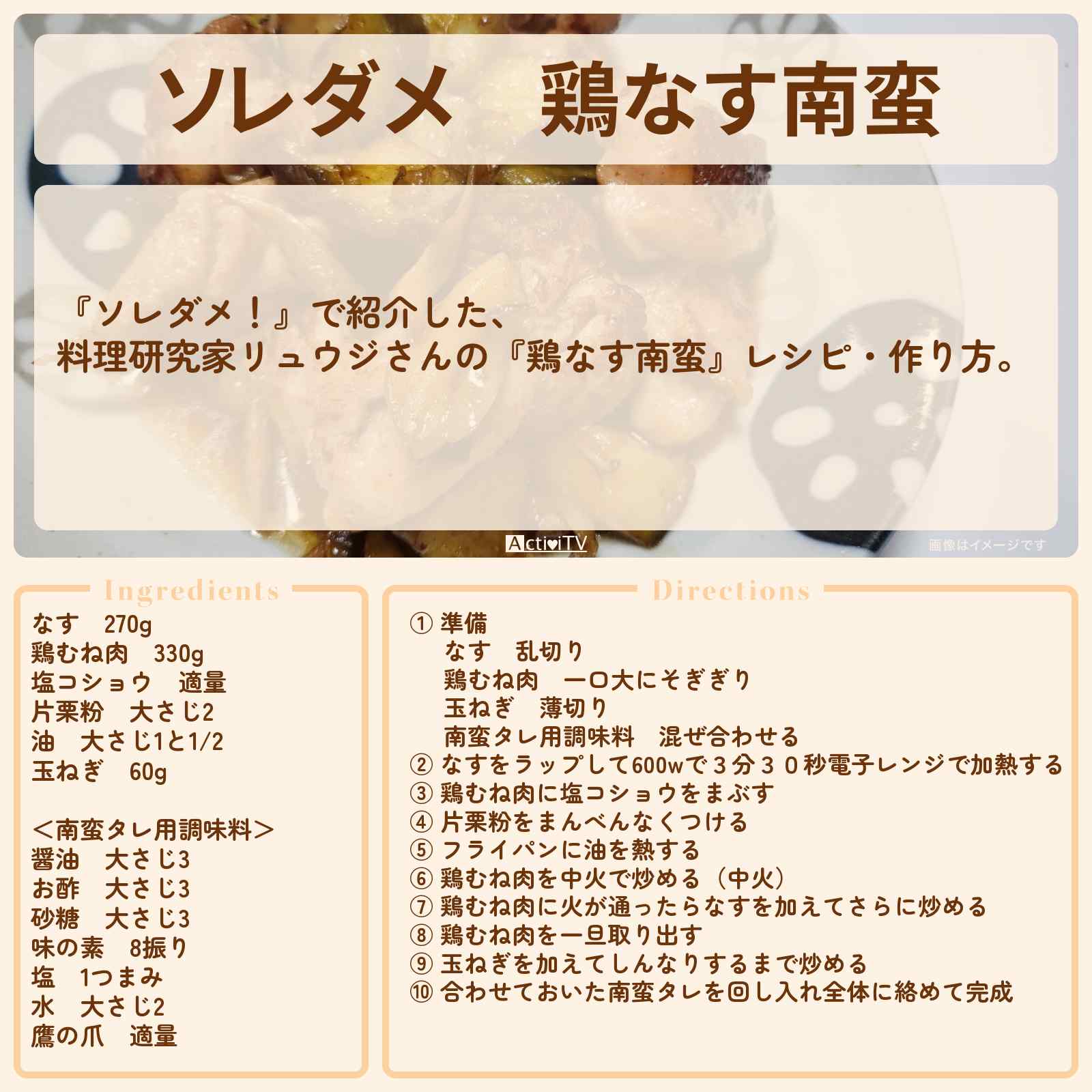 (水)放送の【ソレダメ!】で紹介した、料理研究家リュウジさんの『鶏なす南蛮』レシピ・作り方。