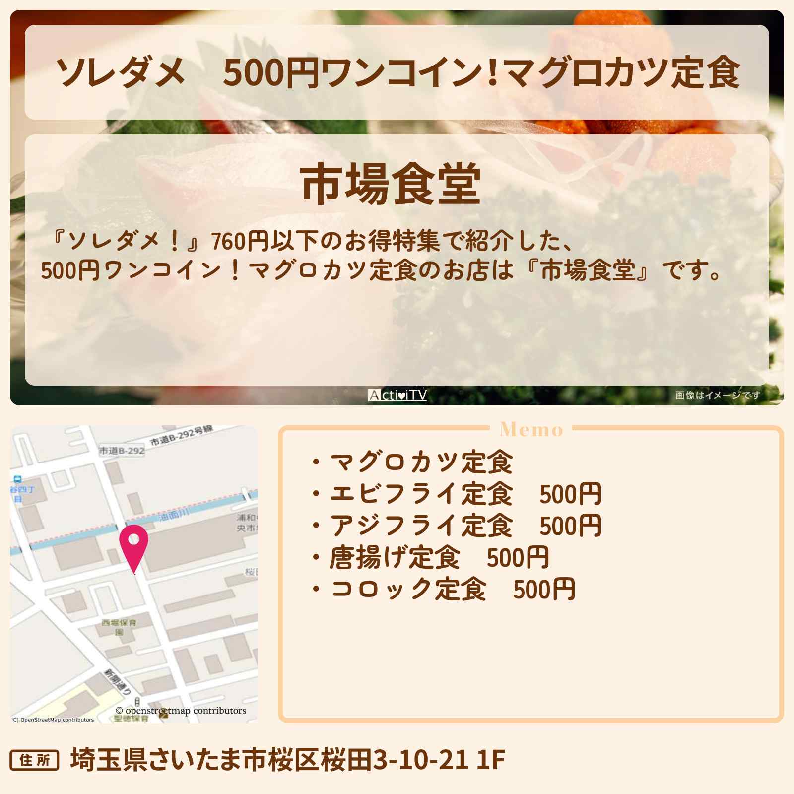 番組で紹介したワンコイン500円ランチはエビフライなど23種類。マグロカツ定食はマグロカツ2個にコロッケ1個のお得感があります。