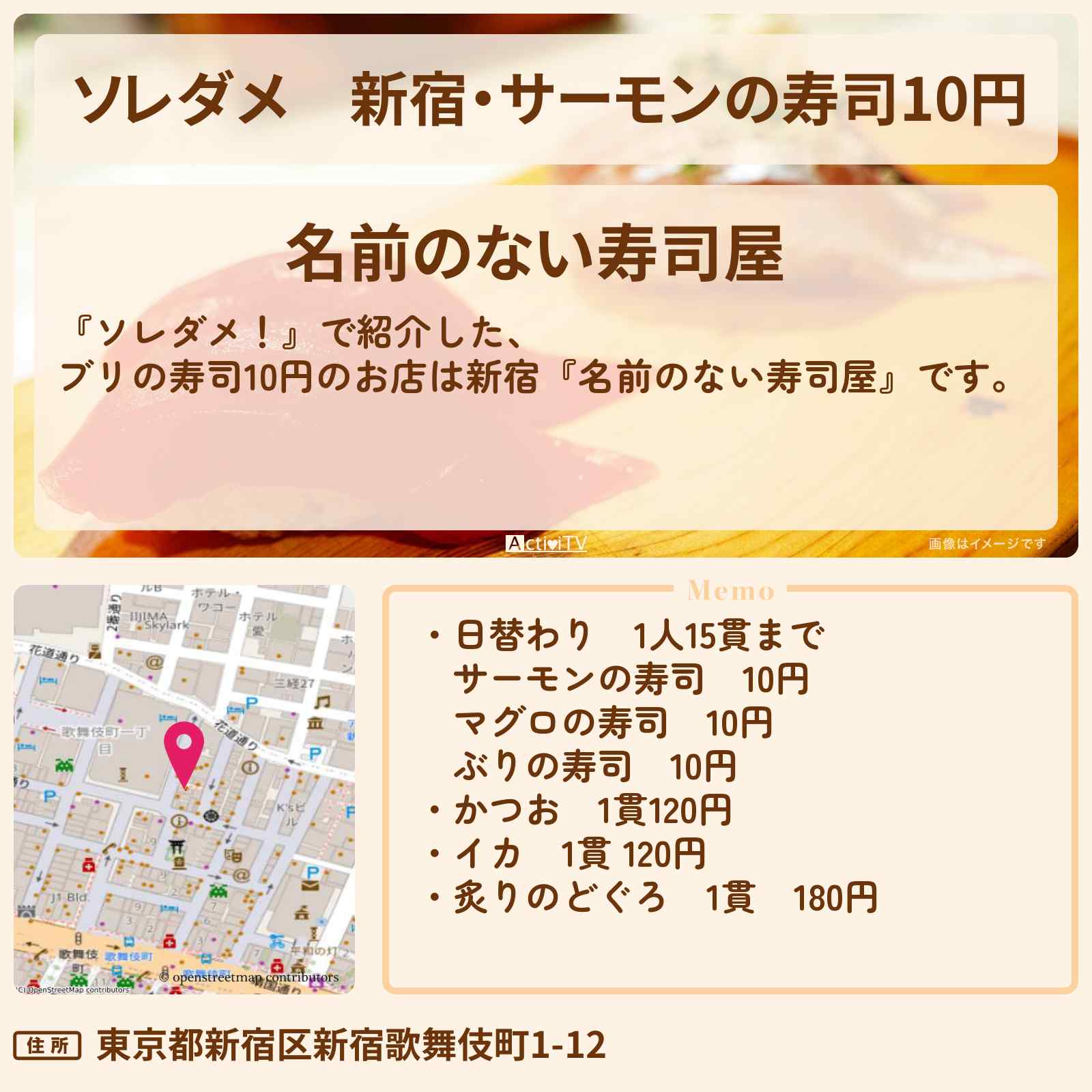 放送の【ソレダメ!】で紹介した、ブリの寿司10円のお店は新宿『名前のない寿司屋』です。