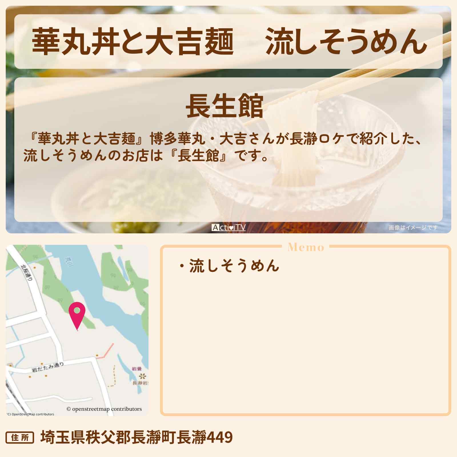 名物は流しそうめんで、毎年GW~10月まで、長生館の敷地内にある流しそうめん食べ放題が楽しめます。そうめんは地元製麺所が粉と水にこだわって作り、おいしい水をぜいたくに使った流しそうめんは長瀞の夏の風情あふれる味覚となっています。奥秩父の山々から流れる美味しい水を使った流しそうめんを、長瀞渓谷を眺めながら楽しむことができ、お子様連れのご家族にも大変人気があります。
