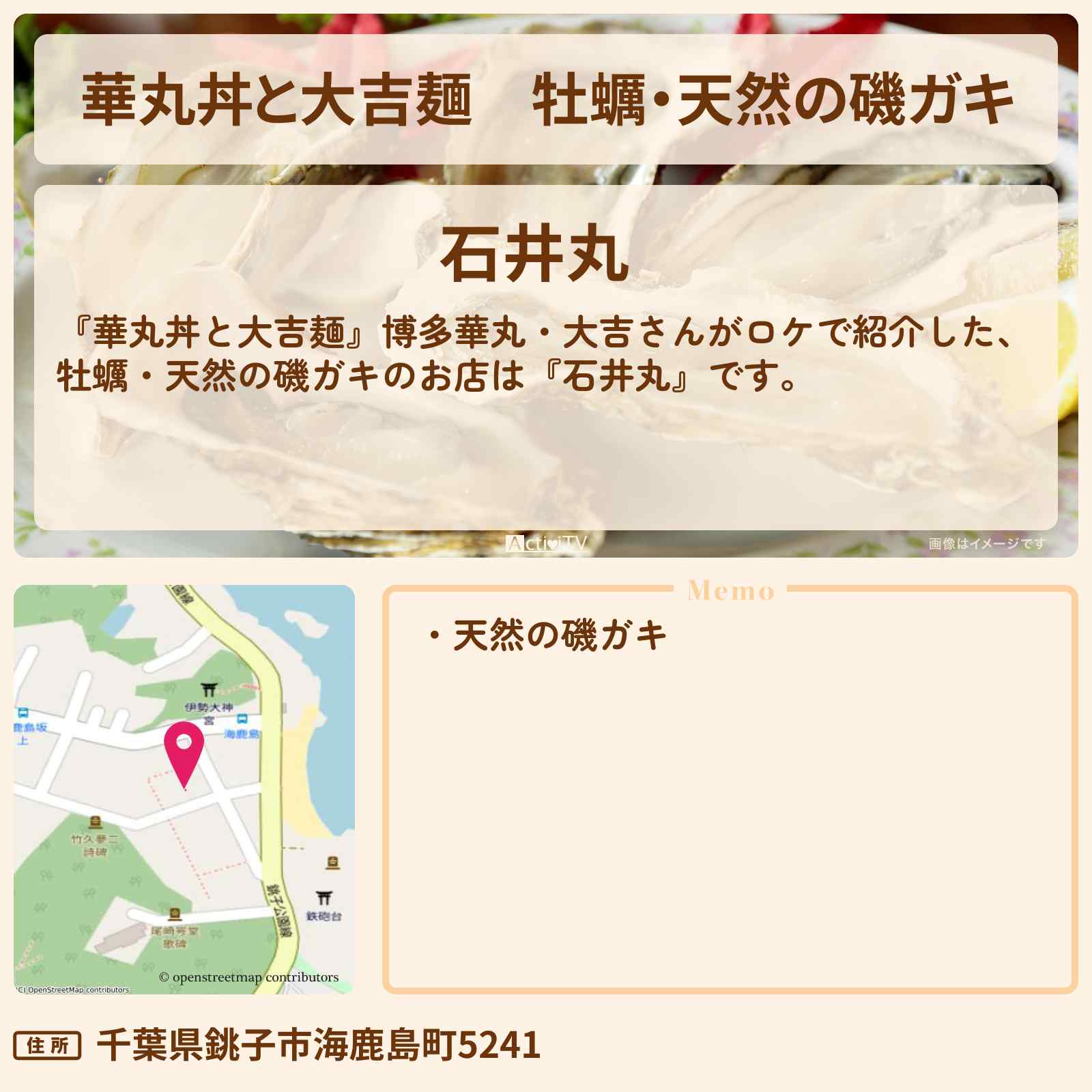 放送の【華丸丼と大吉麺】博多華丸・大吉さんがロケで紹介した、牡蠣・天然の磯ガキのお店は『石井丸』です。
