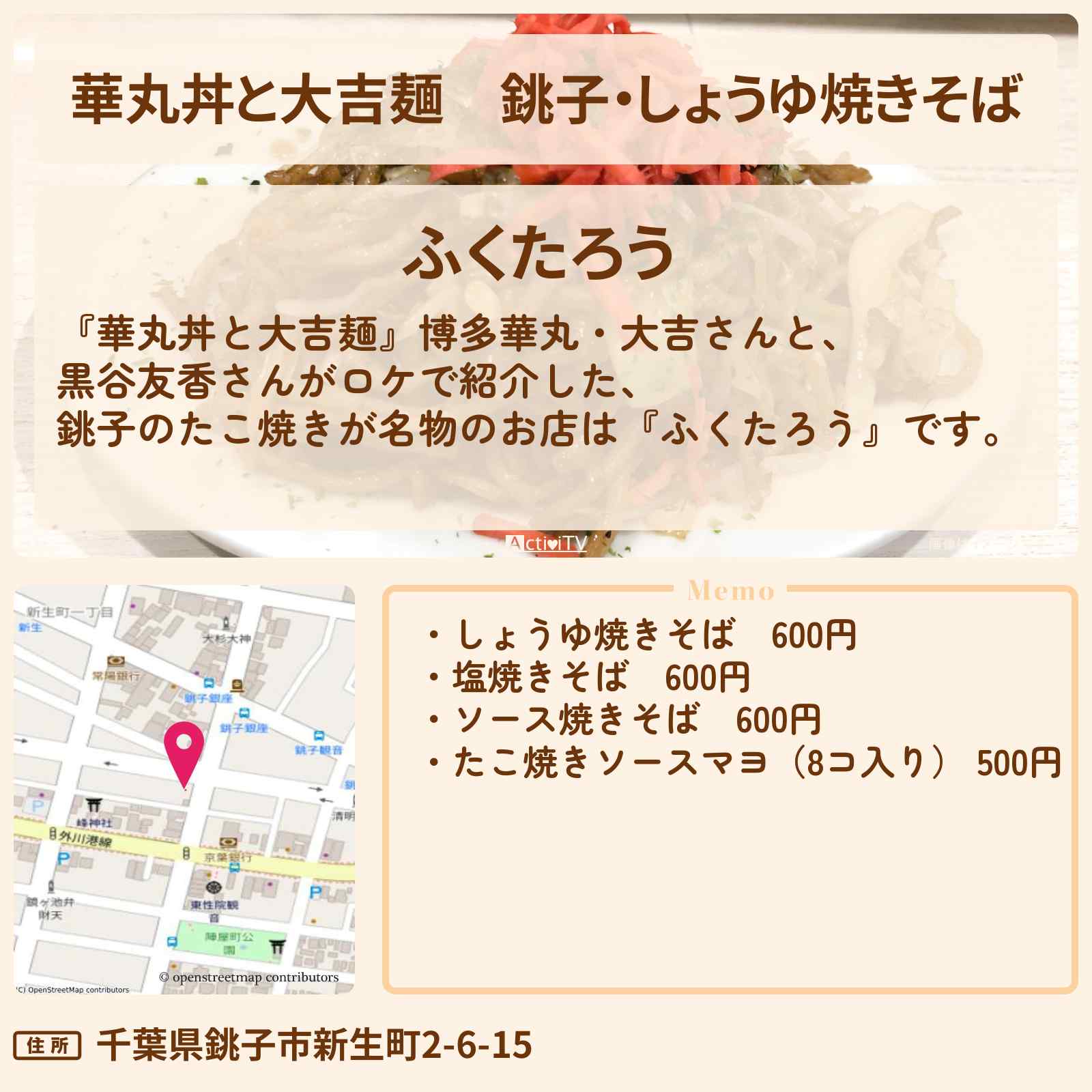 放送の【華丸丼と大吉麺】博多華丸・大吉さんと、黒谷友香さんがロケで紹介した、銚子のたこ焼きが名物のお店は『ふくたろう』です。