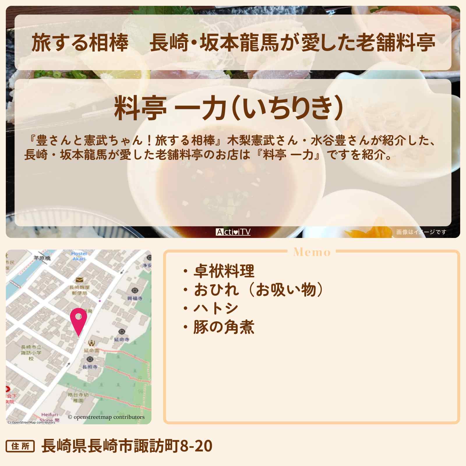 放送の【豊さんと憲武ちゃん!旅する相棒】木梨憲武さん・水谷豊さんが紹介した、長崎・坂本龍馬が愛した老舗料亭のお店は『料亭 一力』ですを紹介。