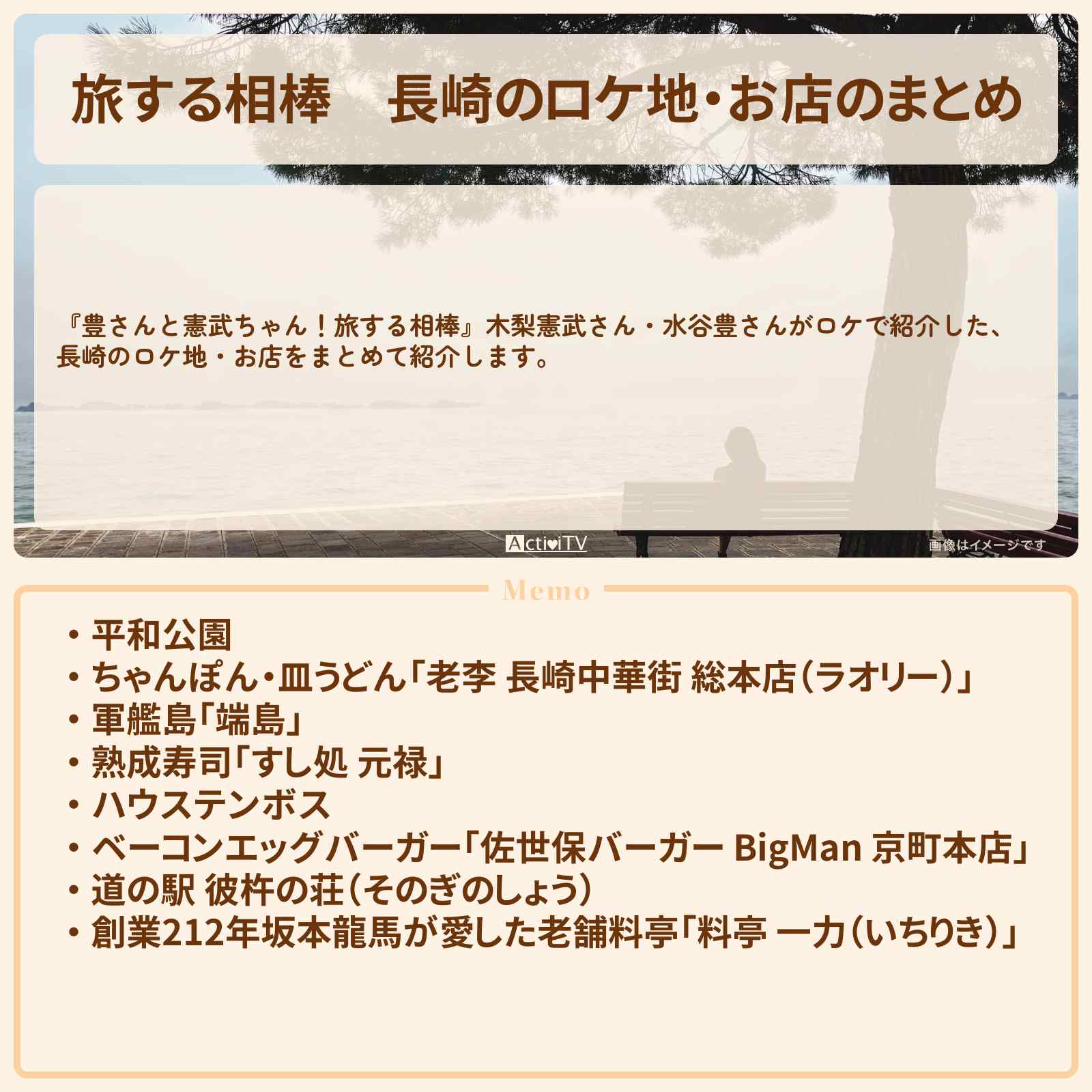 放送の【豊さんと憲武ちゃん!旅する相棒】木梨憲武さん・水谷豊さんがロケで紹介した、長崎のロケ地・お店をまとめて紹介します。