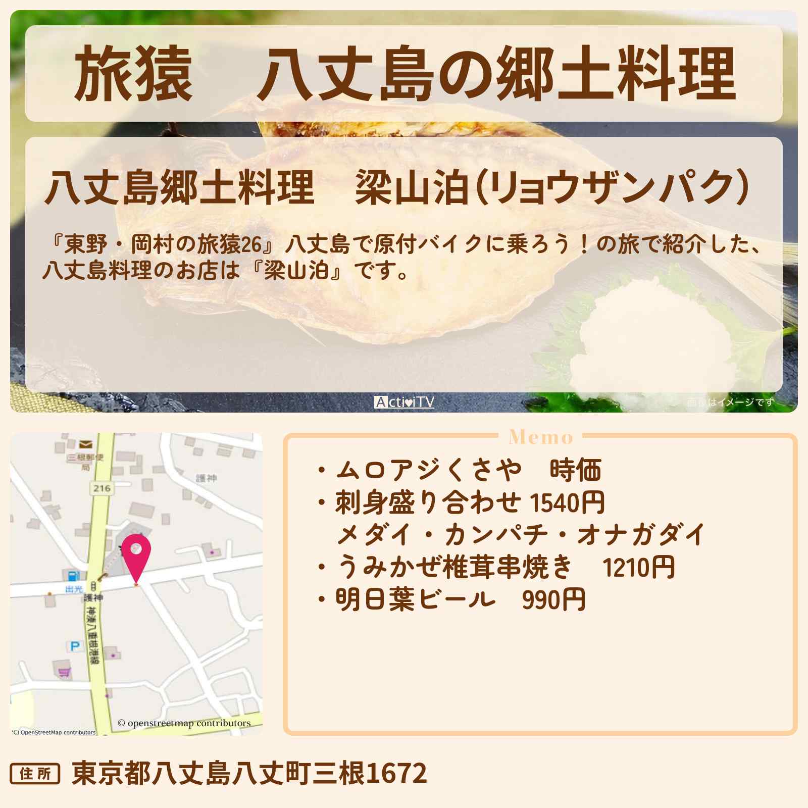 放送の【東野・岡村の旅猿26】八丈島で原付バイクに乗ろう!の旅で紹介した、八丈島料理のお店は『梁山泊』です。