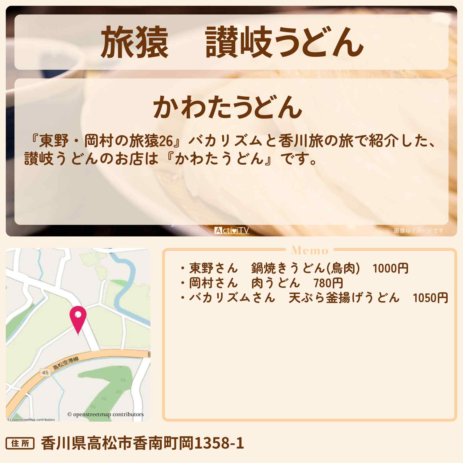 【旅猿】讃岐うどん『かわたうどん』香川のお店の場所〔バカリズム〕