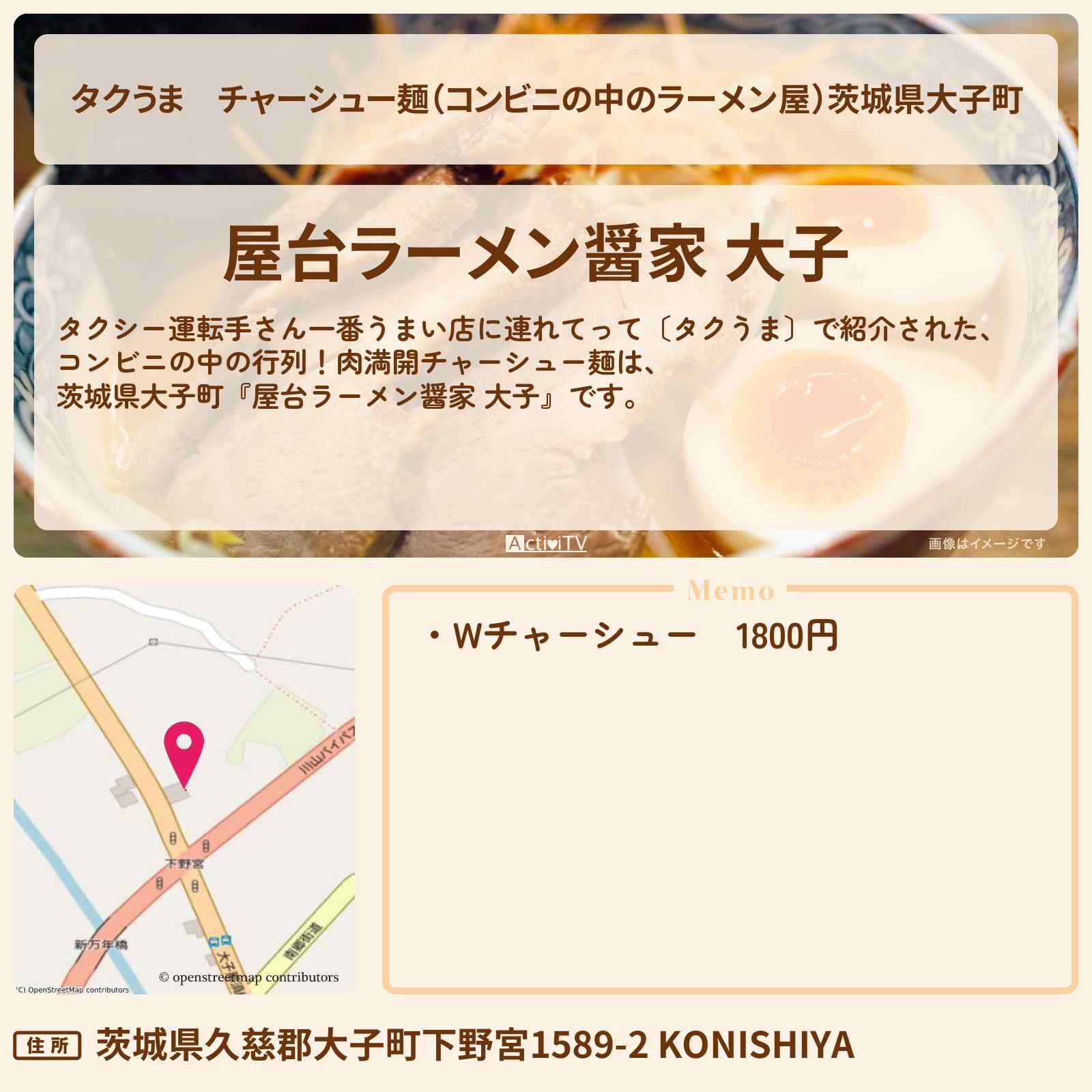 放送のタクシー運転手さん一番うまい店に連れてって〔タクうま〕で紹介された、コンビニの中の行列!肉満開チャーシュー麺は、茨城県大子町『屋台ラーメン醤家 大子』です。