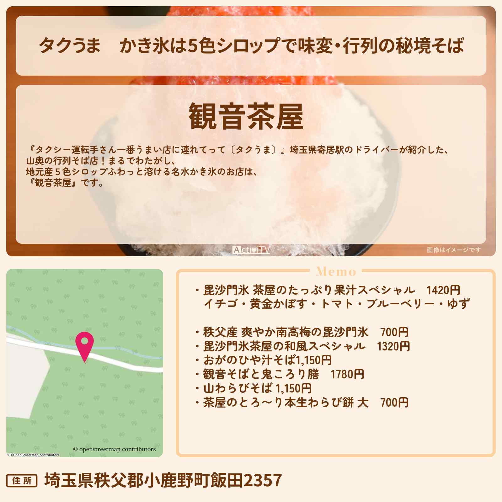 放送の【タクシー運転手さん一番うまい店に連れてって〔タクうま〕】埼玉県寄居駅のドライバーが紹介した、山奥の行列そば店!まるでわたがし、地元産5色シロップふわっと溶ける名水かき氷のお店は『観音茶屋』です。