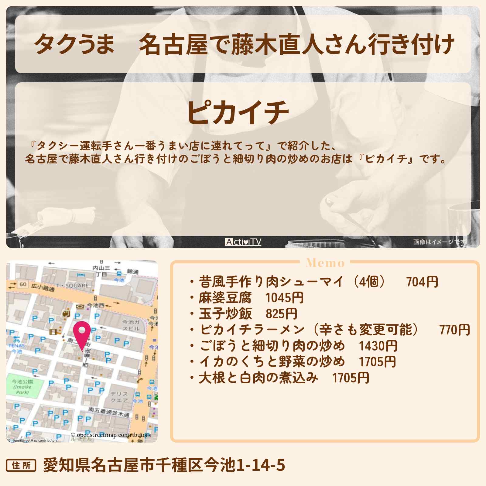 放送の【タクシー運転手さん一番うまい店に連れてって】で紹介した、名古屋で藤木直人さん行き付けのごぼうと細切り肉の炒めのお店は『ピカイチ』です。