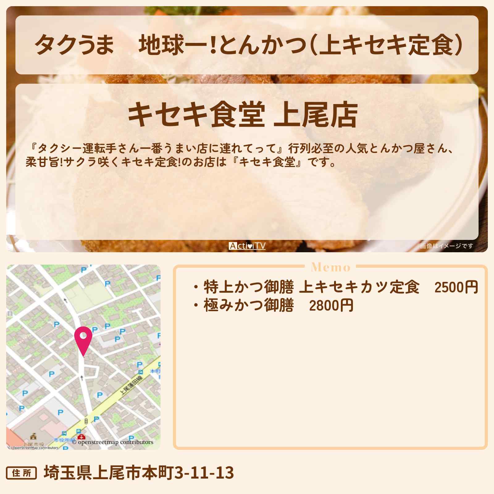 【評点★4.7 Excellent!】【ネット予約可】キセキ食堂(和食/和食全般)の予約なら、お得なクーポン満載、24時間ネット予約でポイントもたまる【ホットペッパーグルメ】!おすすめは「低温熟成」という調理法により、サクッとした衣の中に肉汁たっぷりの肉が閉じ込められたとんかつを実現。 埼玉県岩槻市にある有名な精肉店直営のレストランの為、肉のプロが厳選したお肉を楽しむことができます!※この店舗はネット予約に対応しています。…
