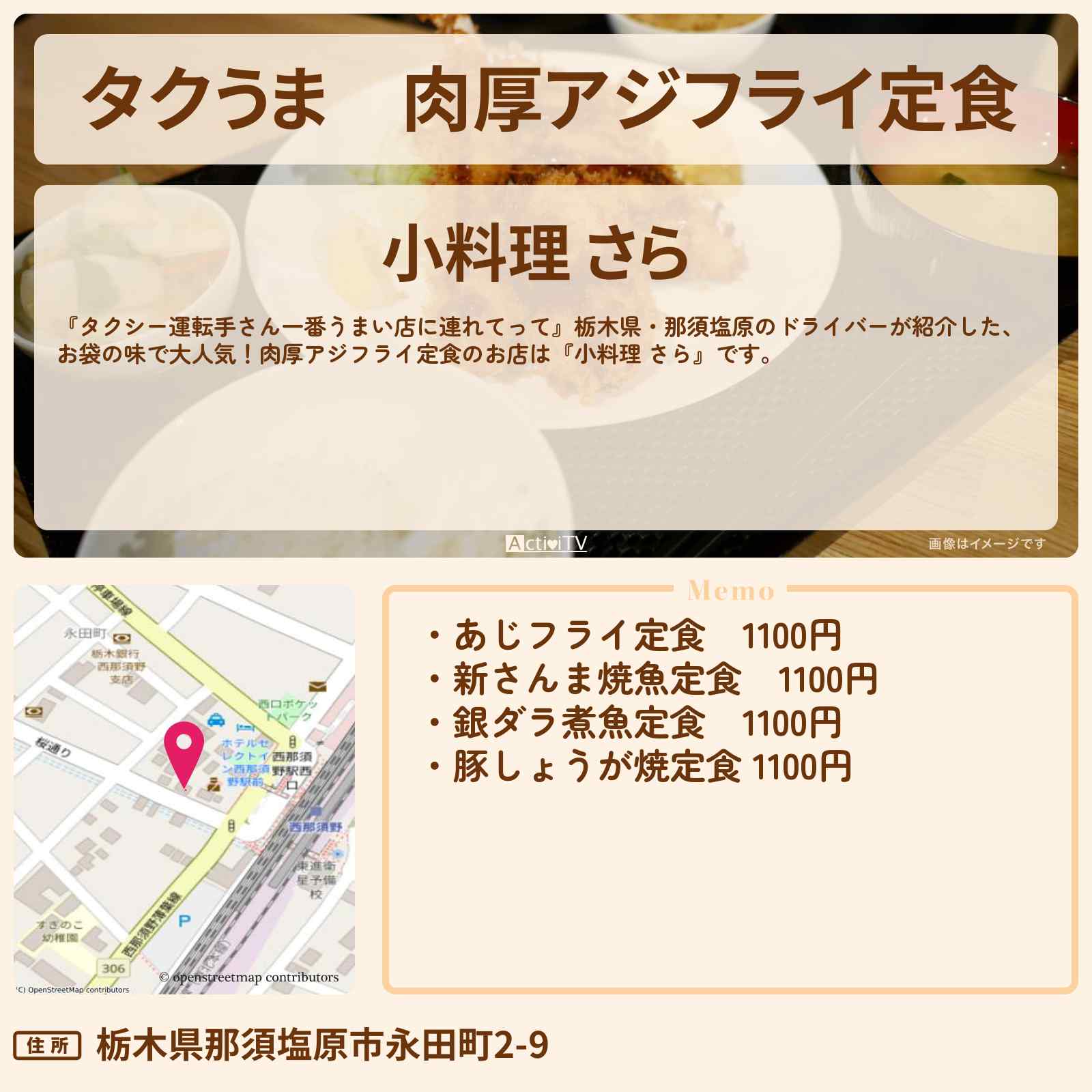 放送の【タクシー運転手さん一番うまい店に連れてって】栃木県・那須塩原のドライバーが紹介した、お袋の味で大人気!肉厚アジフライ定食のお店は『小料理 さら』です。
