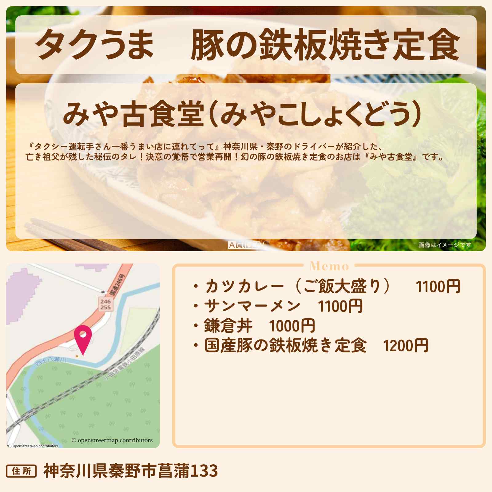 放送の【タクシー運転手さん一番うまい店に連れてって】神奈川県・秦野のドライバーが紹介した、亡き祖父が残した秘伝のタレ!決意の覚悟で営業再開!幻の豚の鉄板焼き定食のお店は『みや古食堂』です。