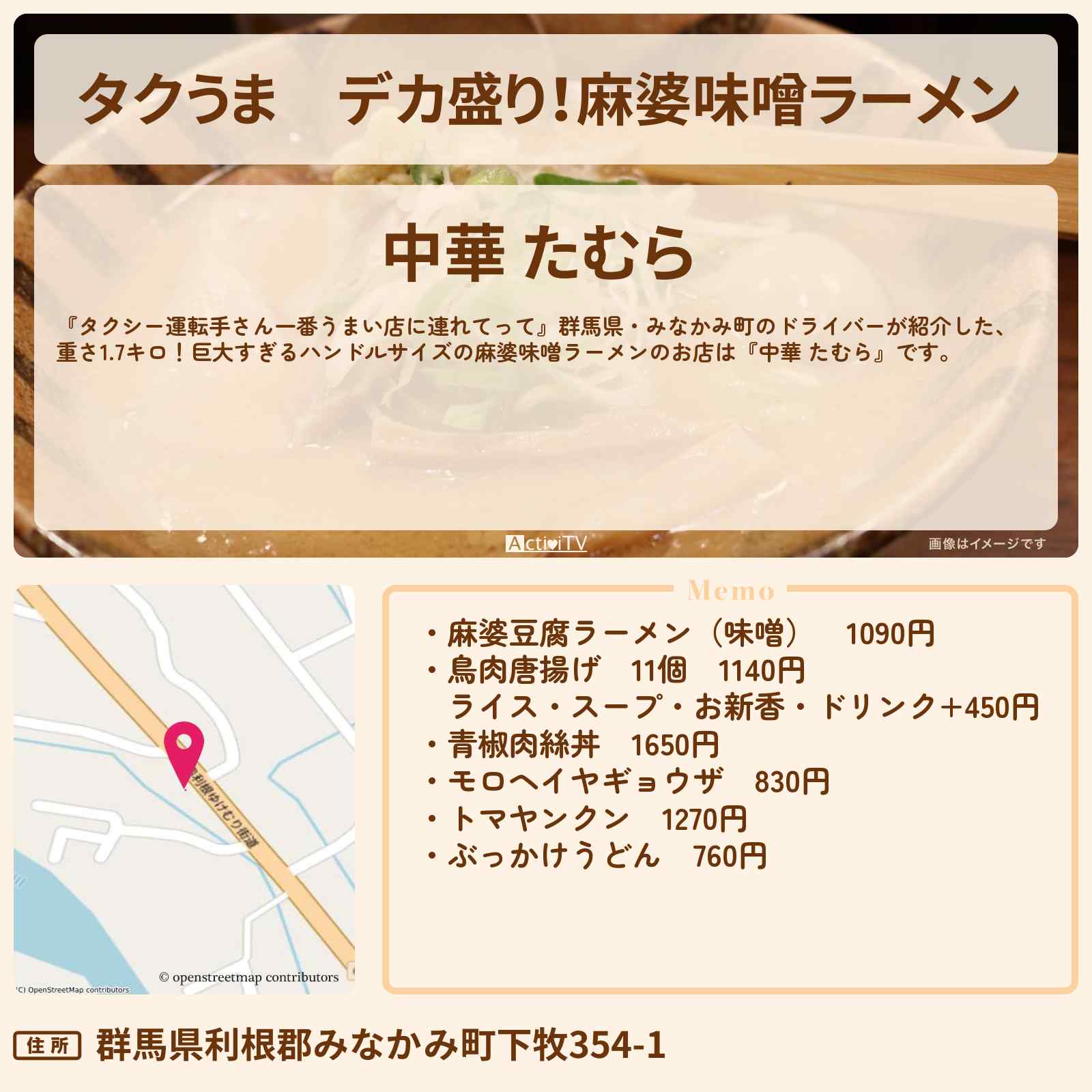 放送の【タクシー運転手さん一番うまい店に連れてって】群馬県・みなかみ町のドライバーが紹介した、重さ1.7キロ!巨大すぎるハンドルサイズの麻婆味噌ラーメンのお店は『中華 たむら』です。
