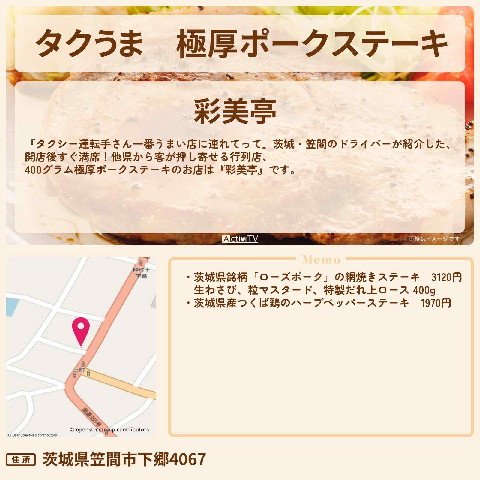 放送の【タクシー運転手さん一番うまい店に連れてって】茨城・笠間のドライバーが紹介した、開店後すぐ満席!他県から客が押し寄せる行列店、400グラム極厚ポークステーキのお店は『彩美亭』です。