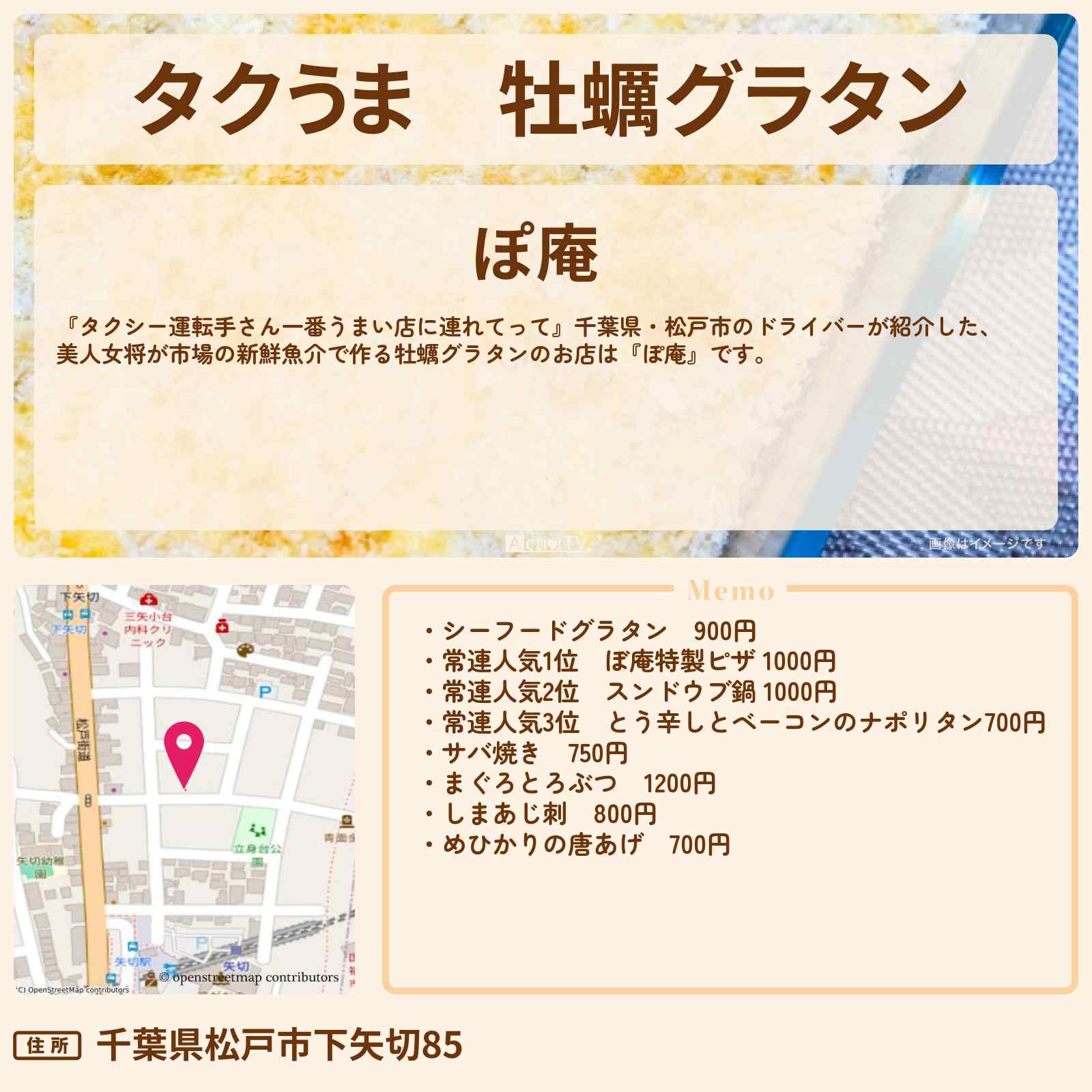 放送の【タクシー運転手さん一番うまい店に連れてって】千葉県・松戸市のドライバーが紹介した、美人女将が市場の新鮮魚介で作る牡蠣グラタンのお店は『ぽ庵』です。