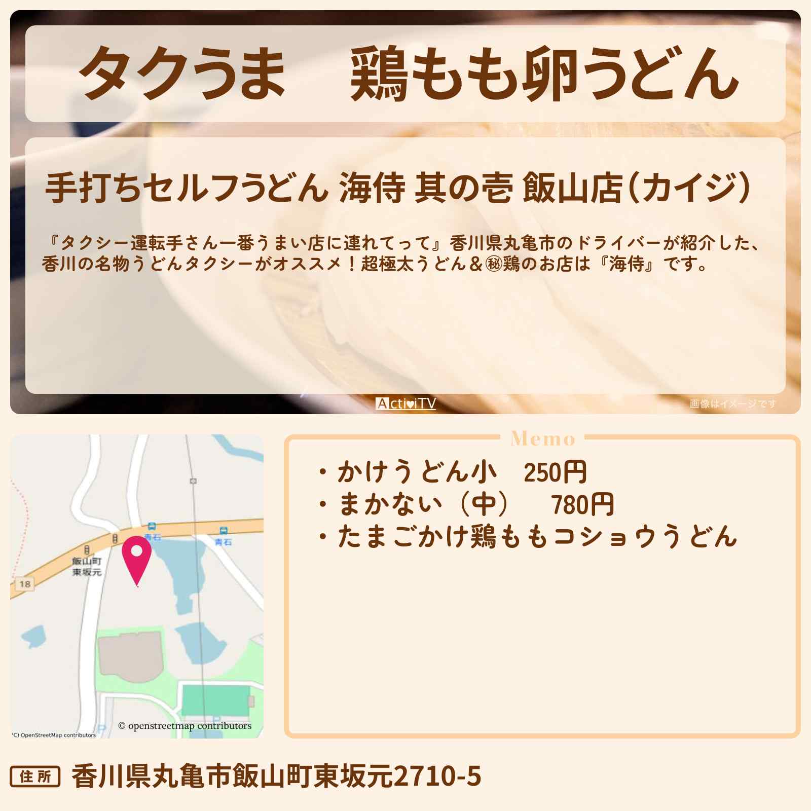 放送の【タクシー運転手さん一番うまい店に連れてって】香川県丸亀市のドライバーが紹介した、香川の名物うどんタクシーがオススメ!超極太うどん&㊙鶏のお店は『海侍』です。