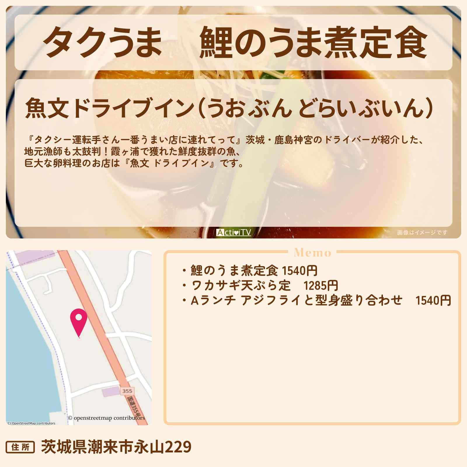 放送の【タクシー運転手さん一番うまい店に連れてって】茨城・鹿島神宮のドライバーが紹介した、地元漁師も太鼓判!霞ヶ浦で獲れた鮮度抜群の魚、巨大な卵料理のお店は『魚文 ドライブイン』です。