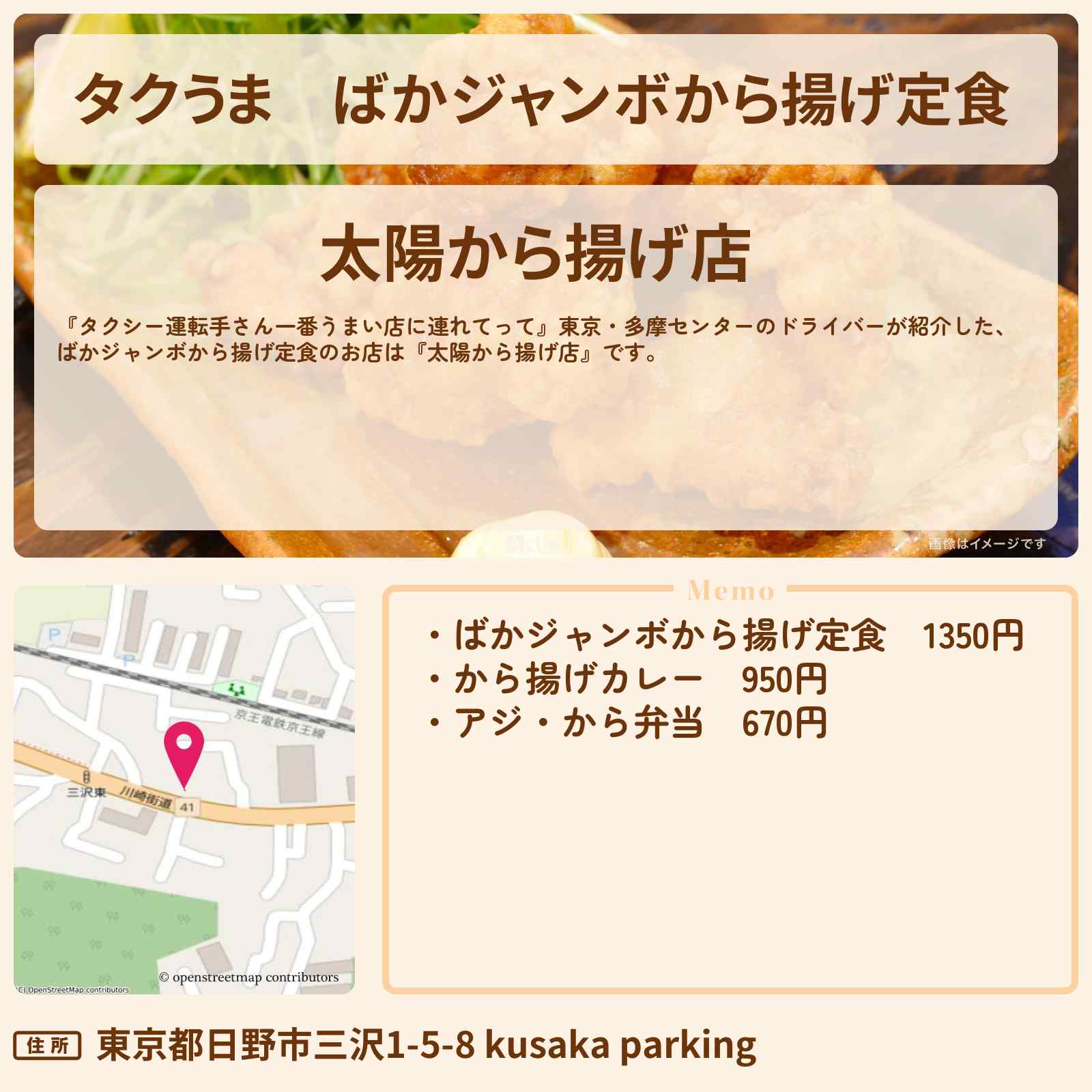 放送の【タクシー運転手さん一番うまい店に連れてって】東京・多摩センターのドライバーが紹介した、ばかジャンボから揚げ定食のお店は『太陽から揚げ店』です。