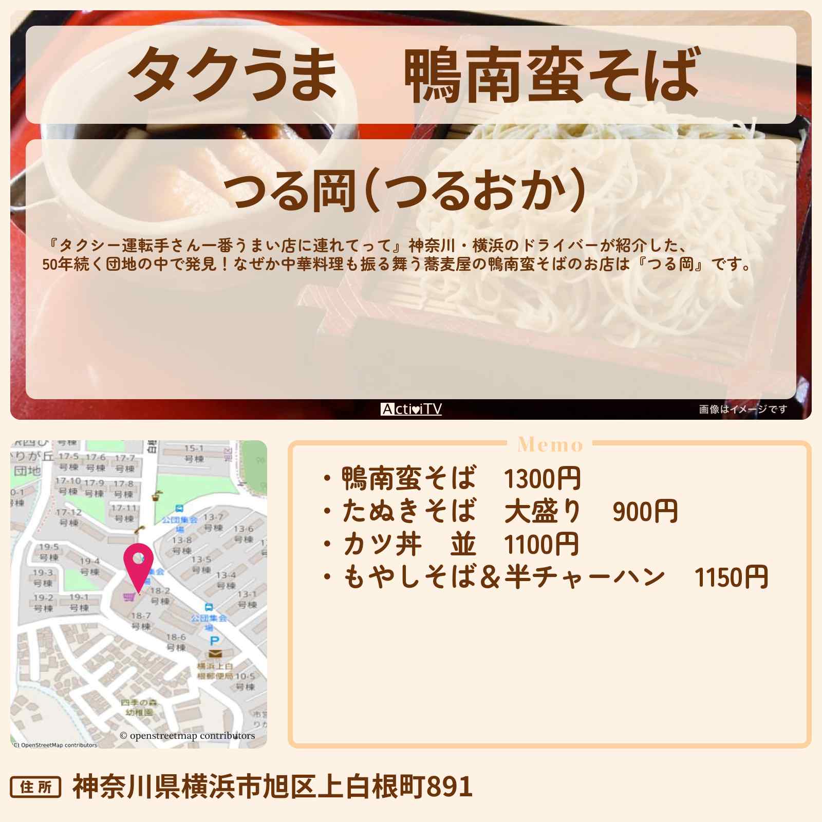 放送の【タクシー運転手さん一番うまい店に連れてって】神奈川・横浜のドライバーが紹介した、50年続く団地の中で発見!なぜか中華料理も振る舞う蕎麦屋の鴨南蛮そばのお店は『つる岡』です。