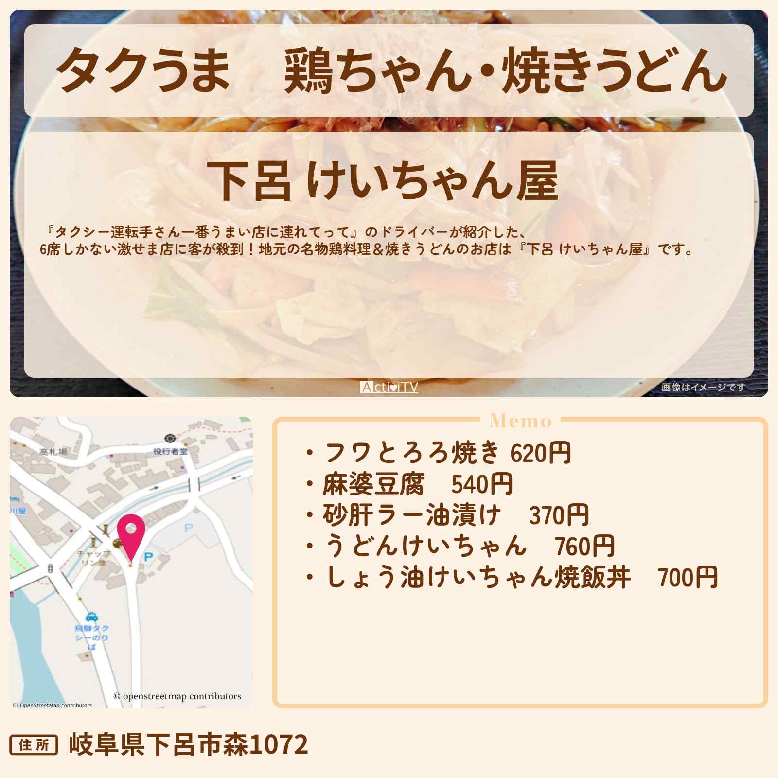 放送の【タクシー運転手さん一番うまい店に連れてって】のドライバーが紹介した、6席しかない激せま店に客が殺到!地元の名物鶏料理&焼きうどんのお店は『下呂 けいちゃん屋』です。