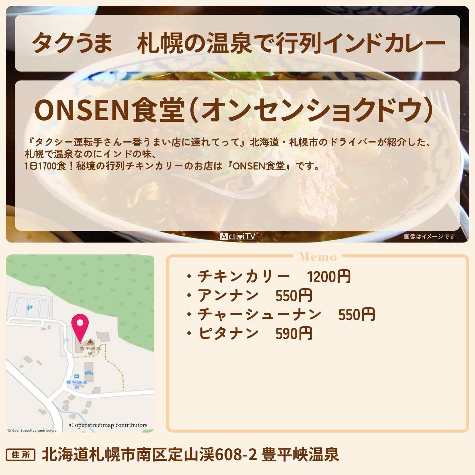 放送の【タクシー運転手さん一番うまい店に連れてって】北海道・札幌市のドライバーが紹介した、札幌で温泉なのにインドの味、1日1700食!秘境の行列チキンカリーのお店は『ONSEN食堂』です。