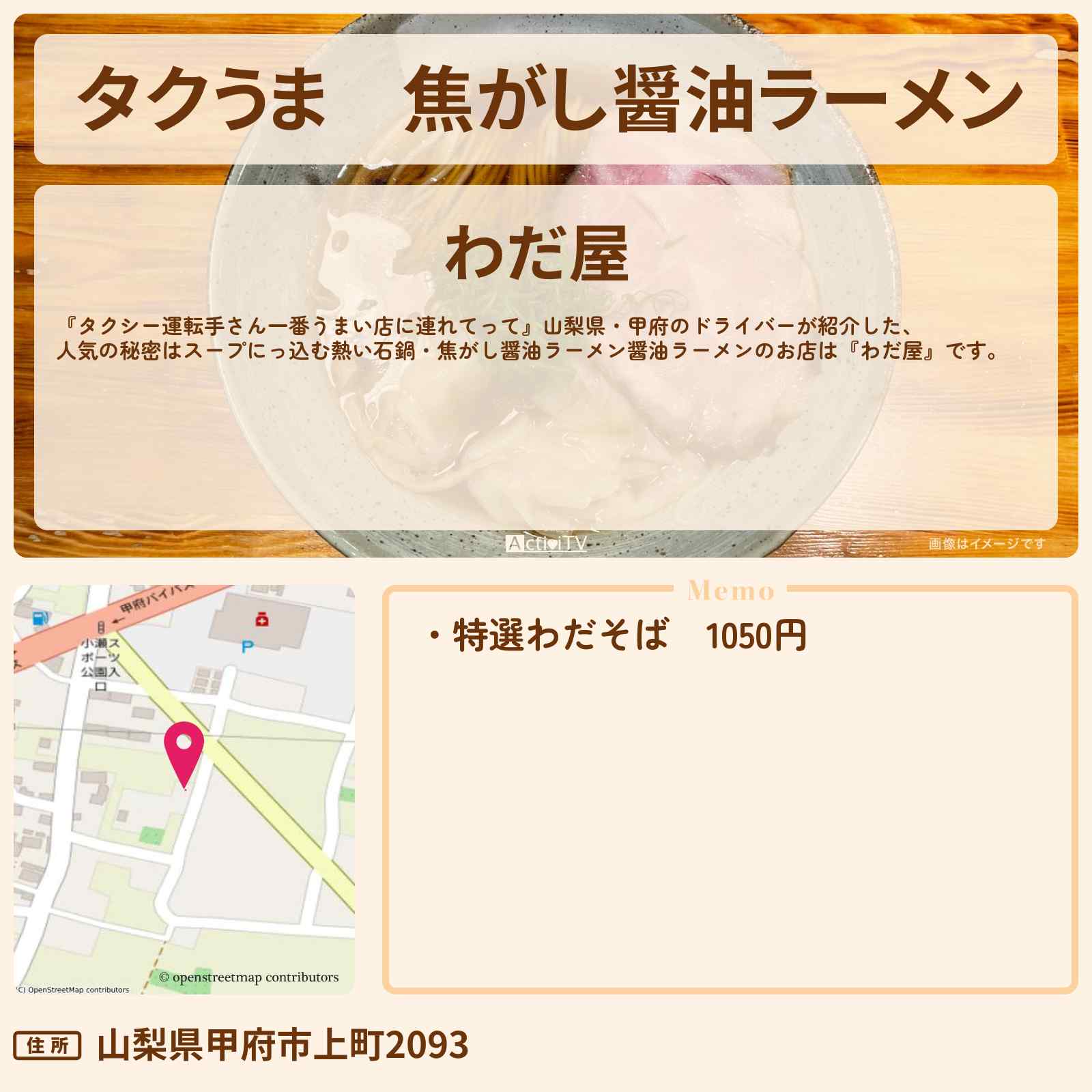 放送の【タクシー運転手さん一番うまい店に連れてって】山梨県・甲府のドライバーが紹介した、人気の秘密はスープにっ込む熱い石鍋・焦がし醤油ラーメン醤油ラーメンのお店は『わだ屋』です。