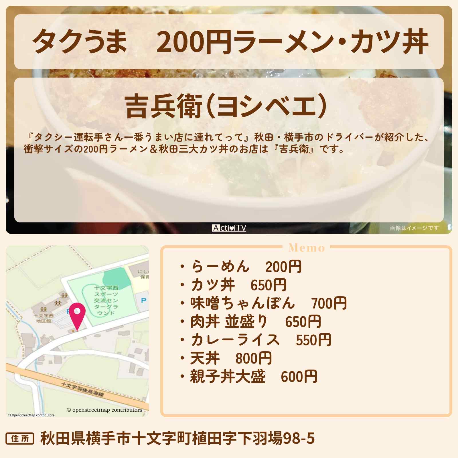 放送の【タクシー運転手さん一番うまい店に連れてって】秋田・横手市のドライバーが紹介した、衝撃サイズの200円ラーメン&秋田三大カツ丼のお店は『吉兵衛』です。