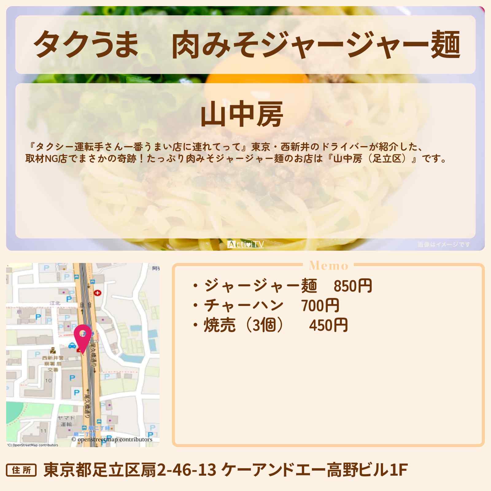 放送の【タクシー運転手さん一番うまい店に連れてって】東京・西新井のドライバーが紹介した、取材NG店でまさかの奇跡!たっぷり肉みそジャージャー麺のお店は『山中房(足立区)』です。