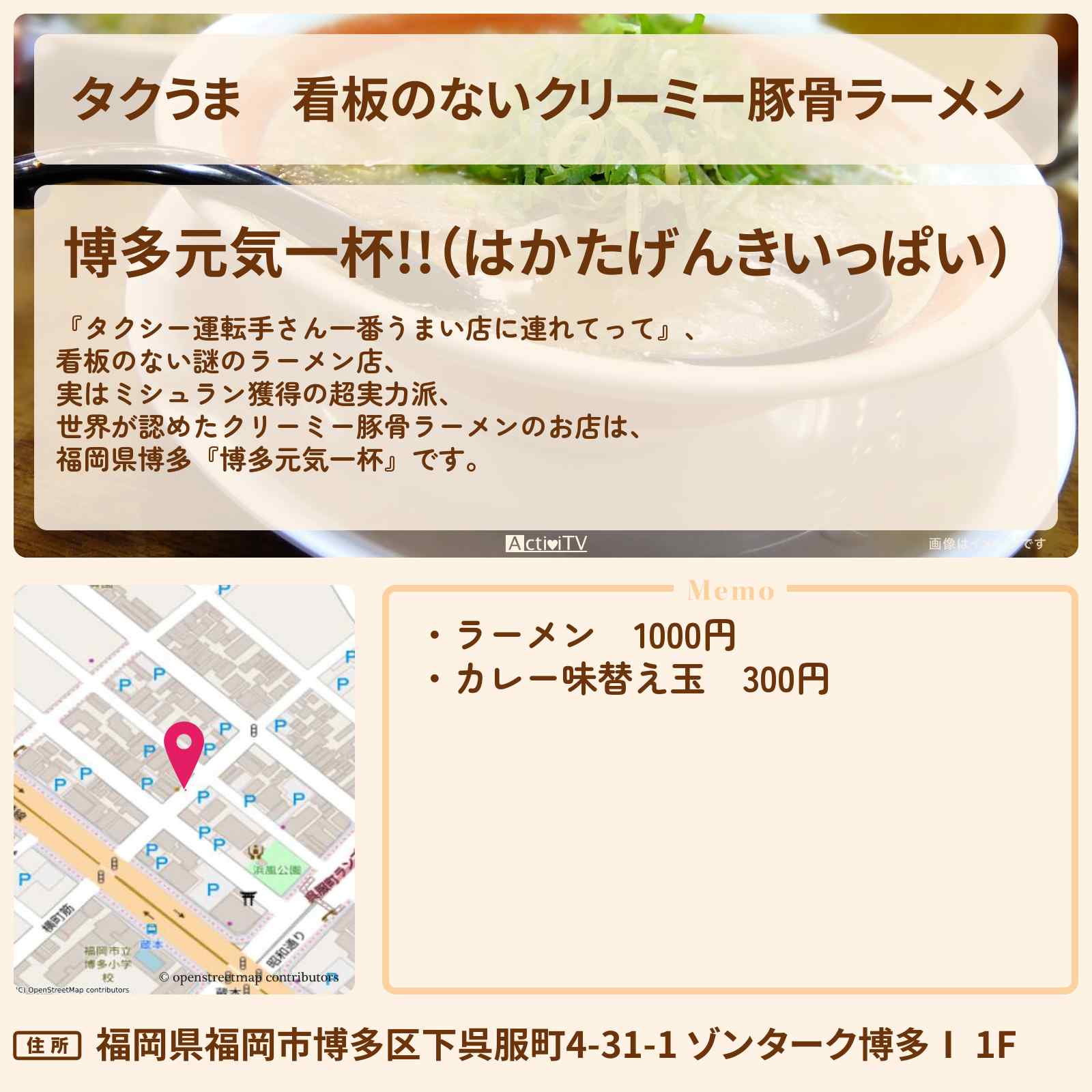 看板のないクリーミー豚骨ラーメン 呉服町駅「博多元気一杯!!(はかたげんきいっぱい)」