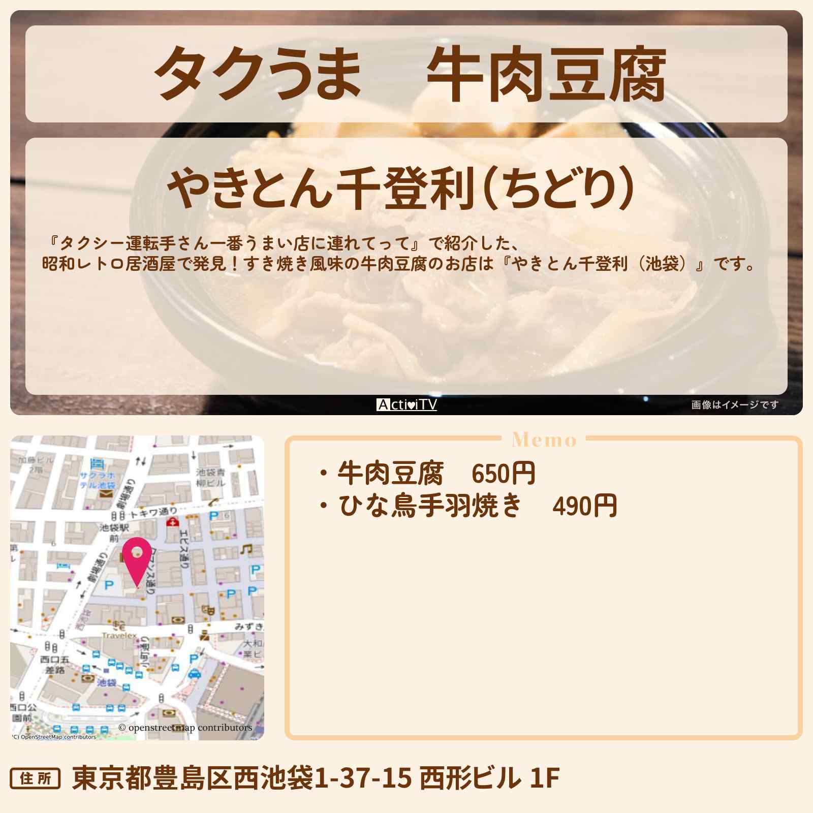 放送の【タクシー運転手さん一番うまい店に連れてって】で紹介した、昭和レトロ居酒屋で発見!すき焼き風味の牛肉豆腐のお店は『やきとん千登利(池袋)』です。