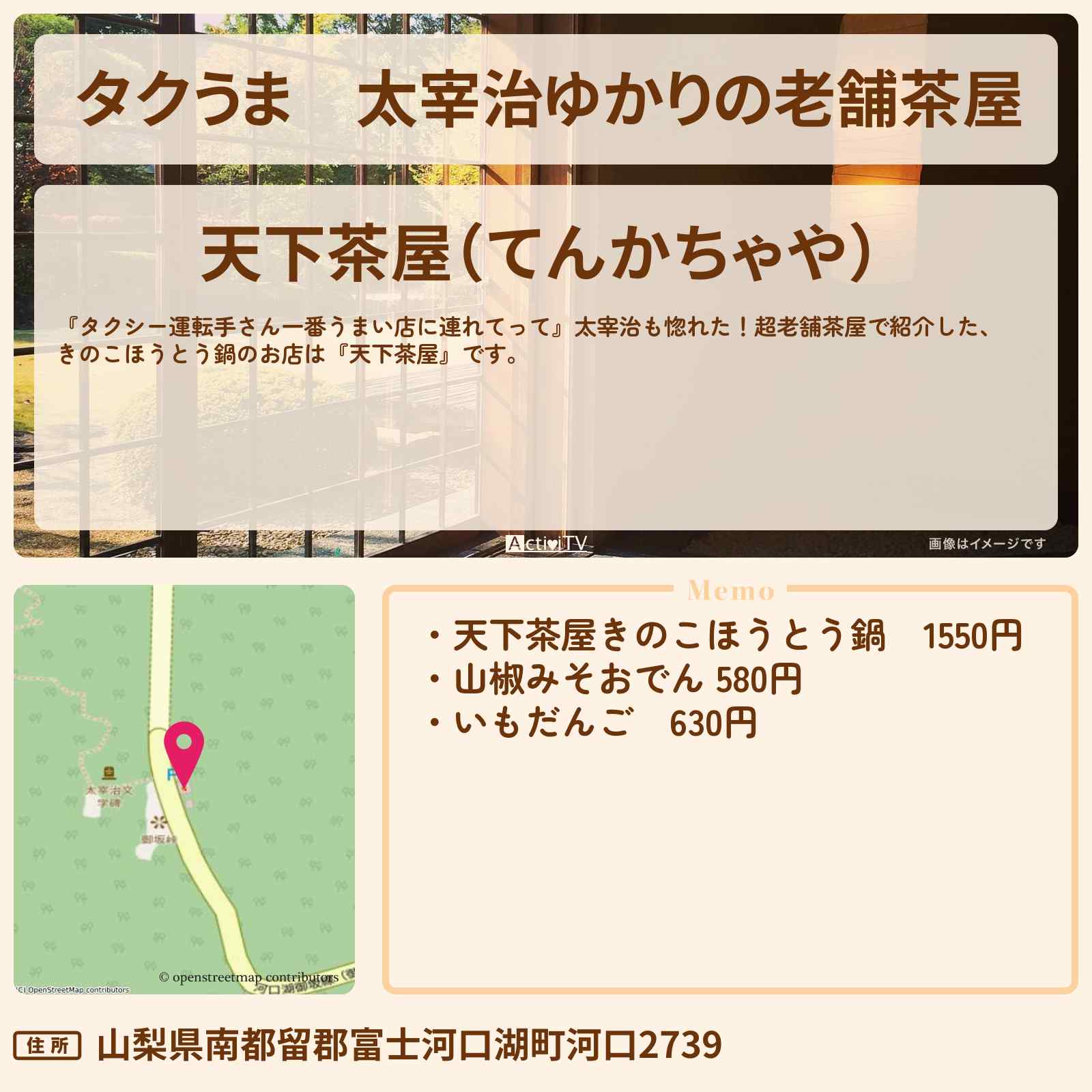 放送の【タクシー運転手さん一番うまい店に連れてって】太宰治も惚れた!超老舗茶屋で紹介した、きのこほうとう鍋のお店は『天下茶屋』です。