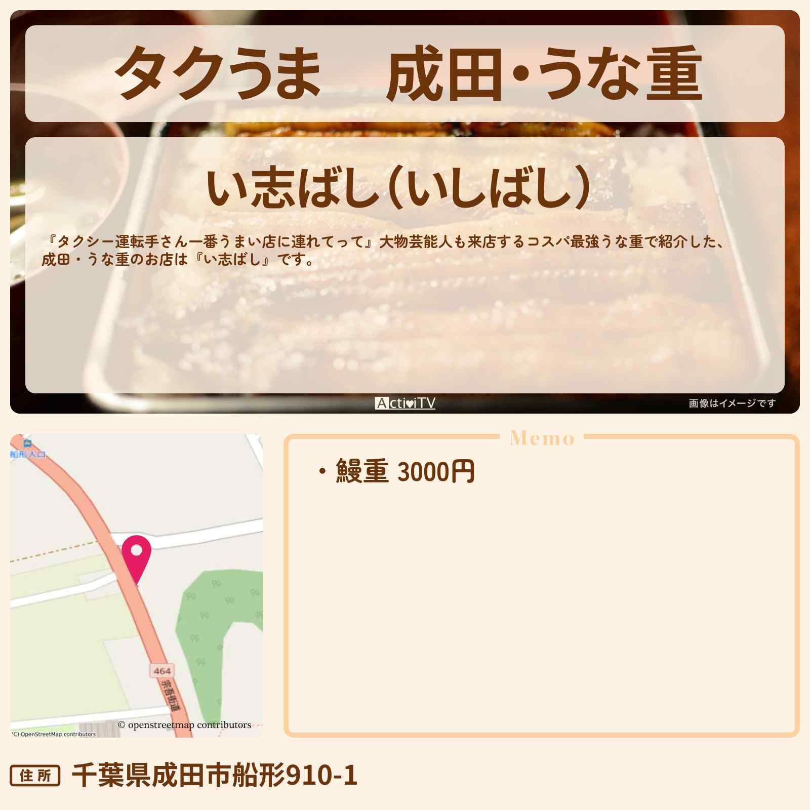 放送の【タクシー運転手さん一番うまい店に連れてって】大物芸能人も来店するコスパ最強うな重で紹介した、成田・うな重のお店は『い志ばし』です。