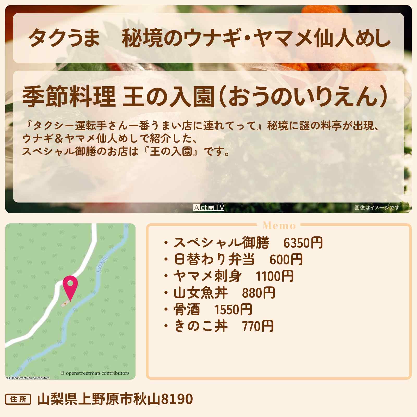 ウナギ・ヤマメのスペシャル御膳「季節料理 王の入園(おうのいりえん)」