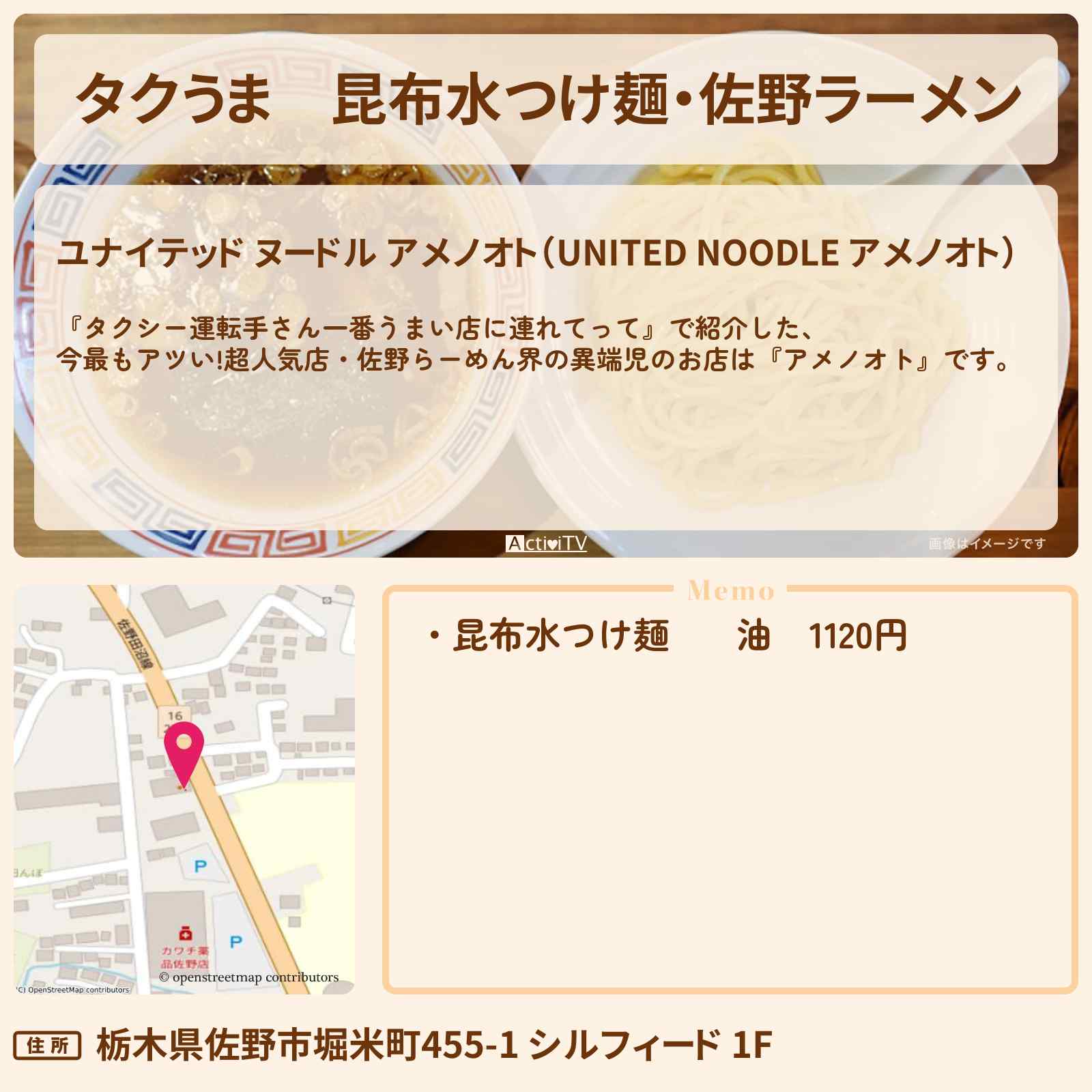 昆布水つけ麺・佐野ラーメン 堀米駅「ユナイテッド ヌードル アメノオト(UNITED NOODLE アメノオト)」