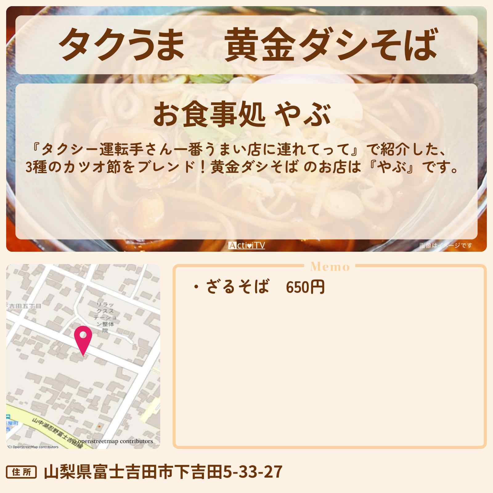 放送の【タクシー運転手さん一番うまい店に連れてって】で紹介した、3種のカツオ節をブレンド!黄金ダシそば のお店は『やぶ』です。