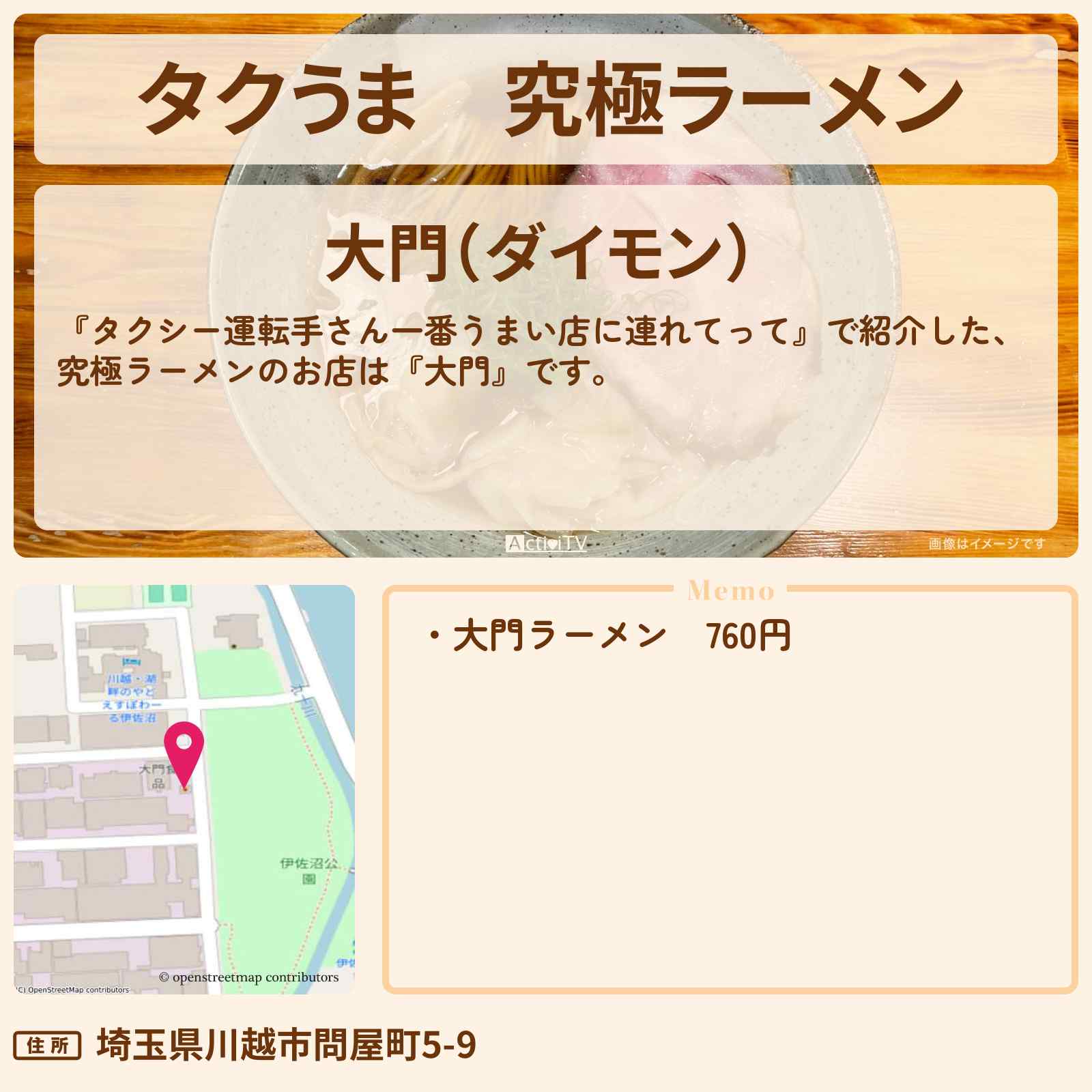 放送の【タクシー運転手さん一番うまい店に連れてって】で紹介した、究極ラーメンのお店は『大門』です。