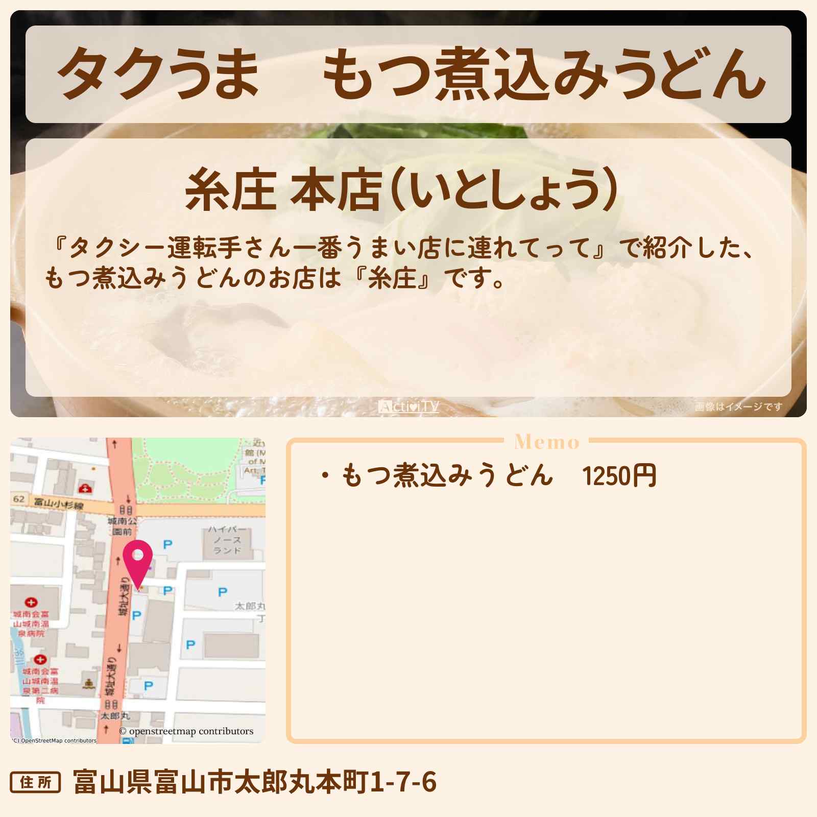 富山名物もつ煮込みうどん 。 創業昭和47年、煮込みうどんの専門店として多くのお客様に愛され続けてきた糸庄。 素材選びから仕込みまで一切手間を惜しまず丁寧に仕上げられた熱々の煮込みうどんは多くの人々に長年愛され続けています。
