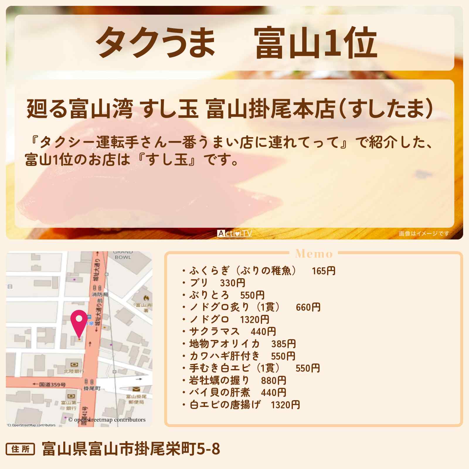 放送の【タクシー運転手さん一番うまい店に連れてって】で紹介した、富山1位のお店は『すし玉』です。