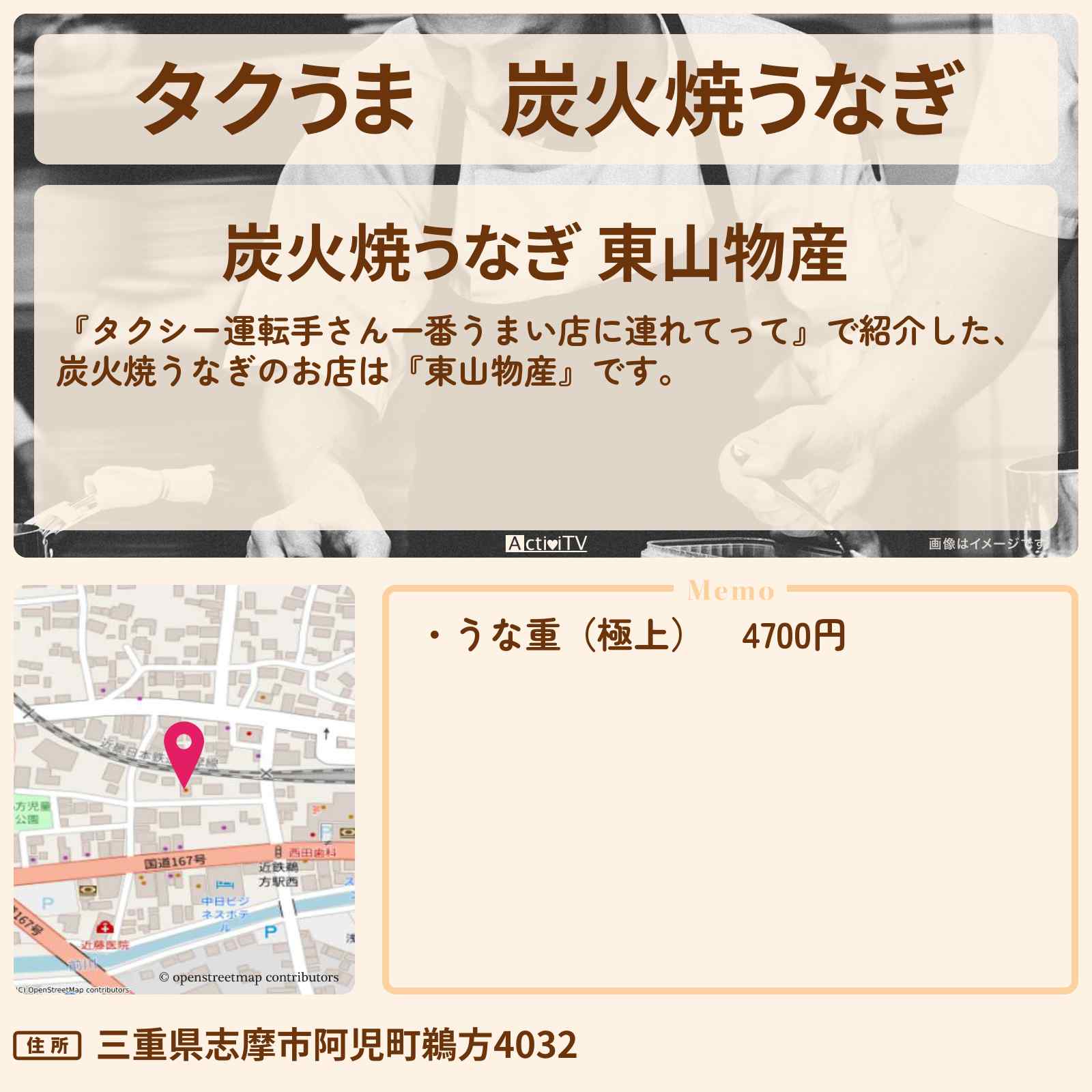 放送の【タクシー運転手さん一番うまい店に連れてって】で紹介した、炭火焼うなぎのお店は『東山物産』です。